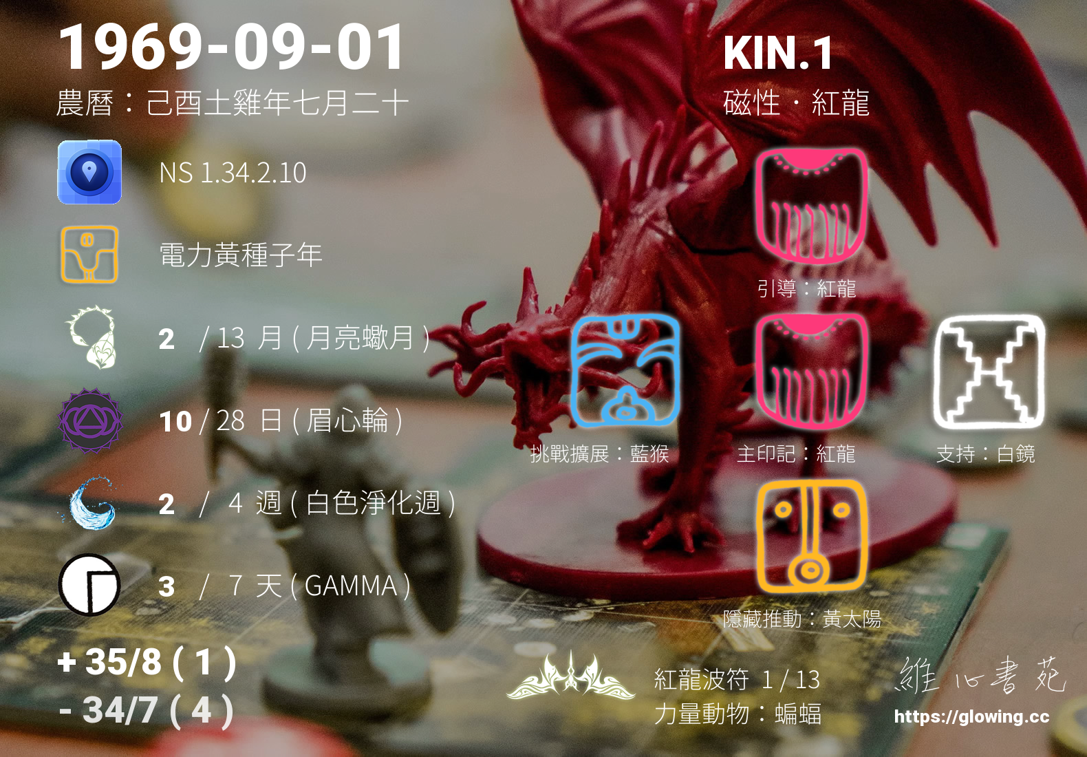 今天的星際原型圖騰為紅龍,我們稱之為主印記, 紅龍是卓爾金曆的第一個圖騰,代表著生命的起源與創造,跟家庭的緣分深刻,動能豐沛。