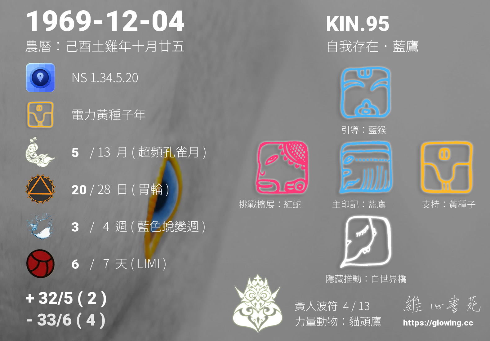 我們可以稱 KIN 95 為 【自我存在藍鷹】 、 【自我存在的藍鷹】 、 【黃人波符 之 自我存在藍鷹】 也可以是 【自我存在藍鷹.黃人波符】 ,你比較喜歡哪一個稱號呢?