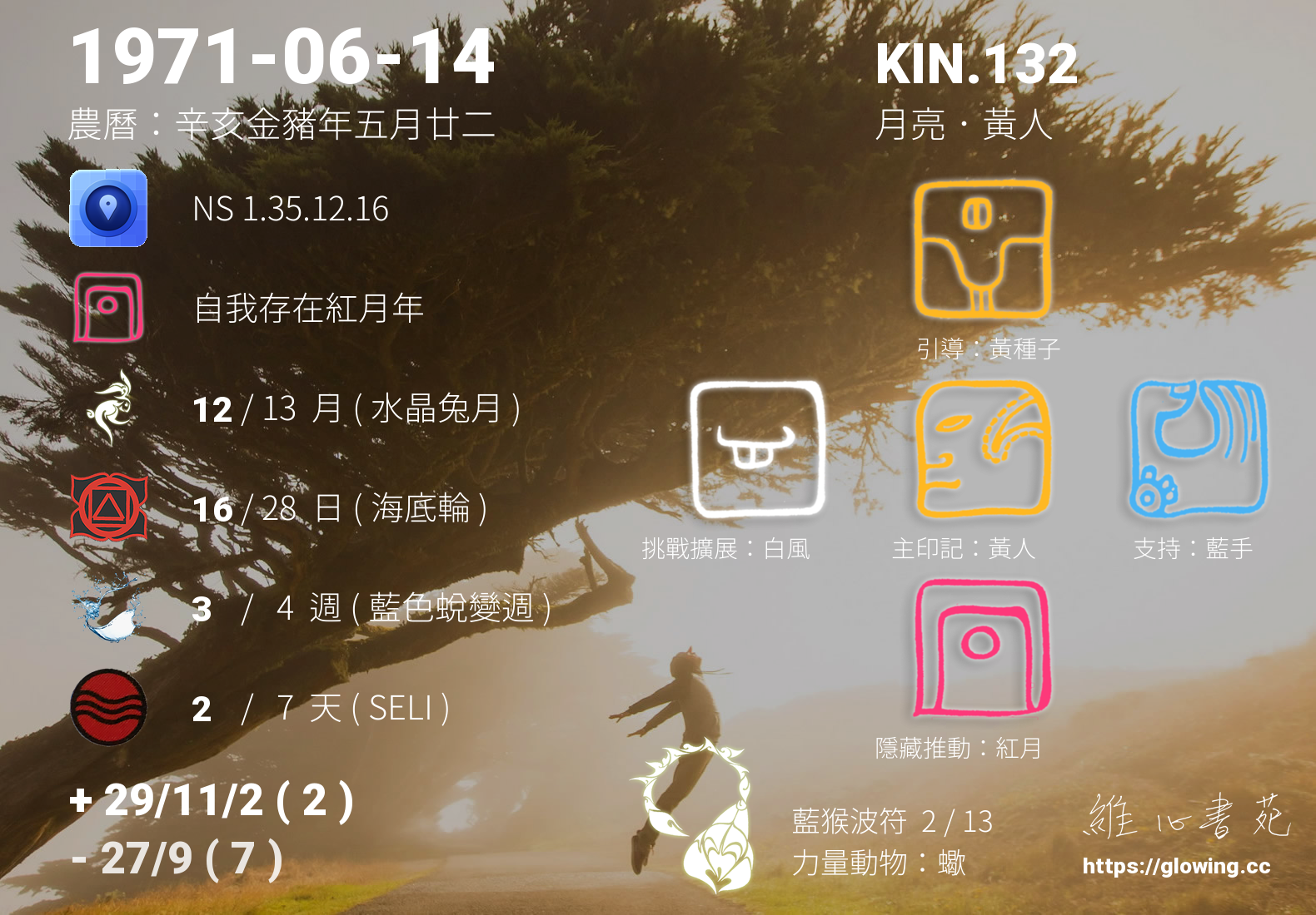 我們可以稱 KIN 132 為 【月亮黃人】 、 【月亮的黃人】 、 【藍猴波符 之 月亮黃人】 也可以是 【月亮黃人.藍猴波符】 ,你比較喜歡哪一個稱號呢?