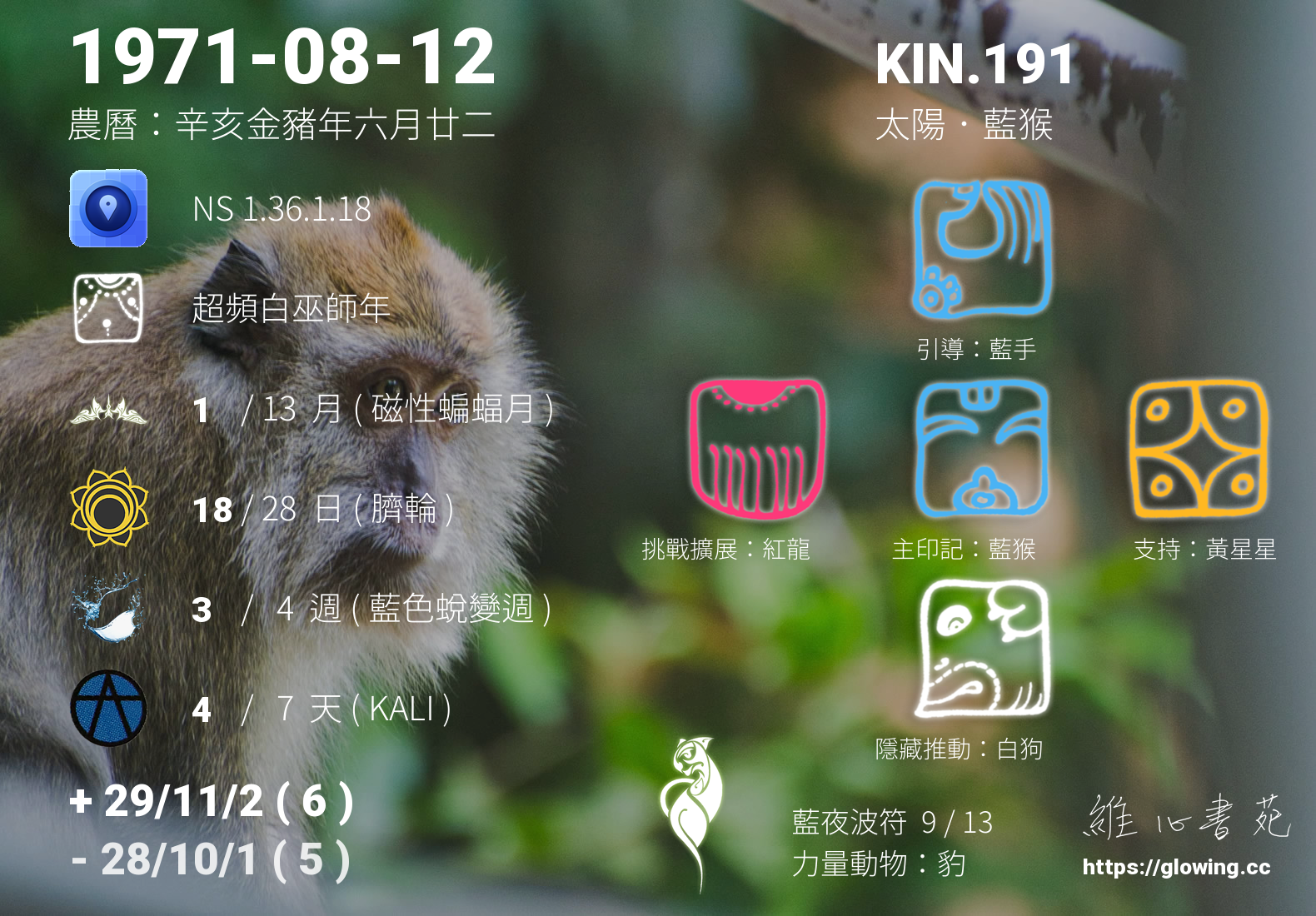 我們可以稱 KIN 191 為 【太陽藍猴】 、 【太陽的藍猴】 、 【藍夜波符 之 太陽藍猴】 也可以是 【太陽藍猴.藍夜波符】 ,你比較喜歡哪一個稱號呢?