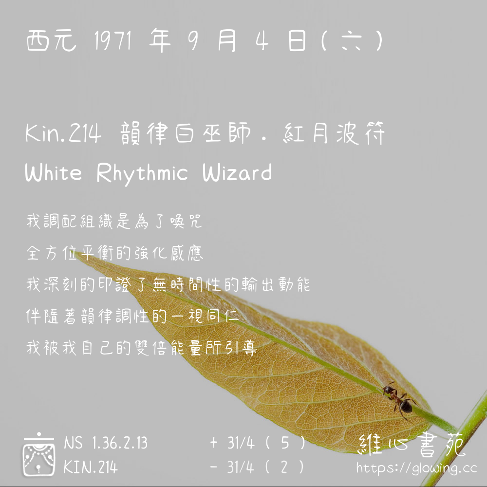 我們可以稱 KIN 214 為 【韻律白巫師】 、 【韻律的白巫師】 、 【紅月波符 之 韻律白巫師】 也可以是 【韻律白巫師.紅月波符】 ,你比較喜歡哪一個稱號呢?