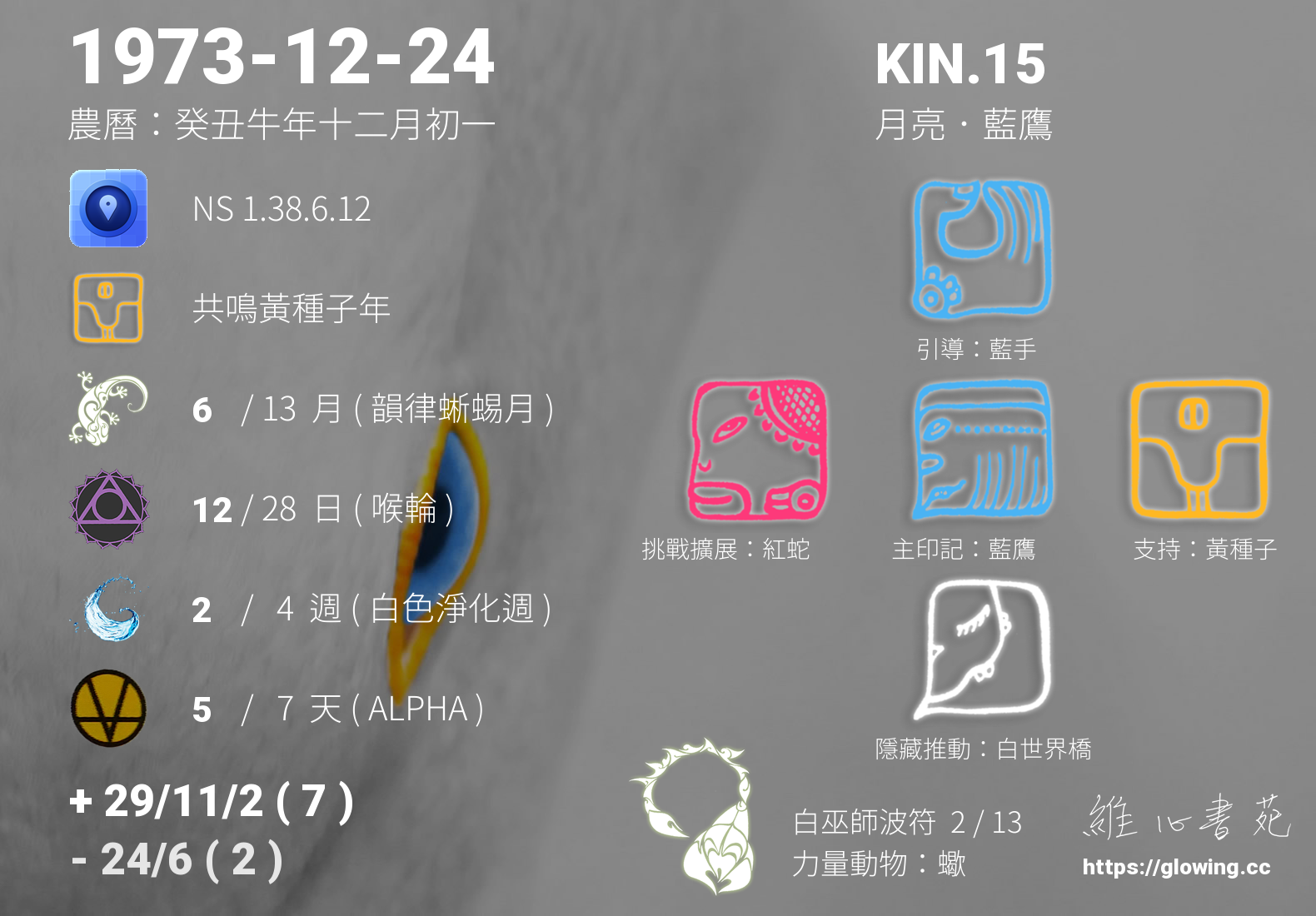 我們可以稱 KIN 15 為 【月亮藍鷹】 、 【月亮的藍鷹】 、 【白巫師波符 之 月亮藍鷹】 也可以是 【月亮藍鷹.白巫師波符】 ,你比較喜歡哪一個稱號呢?