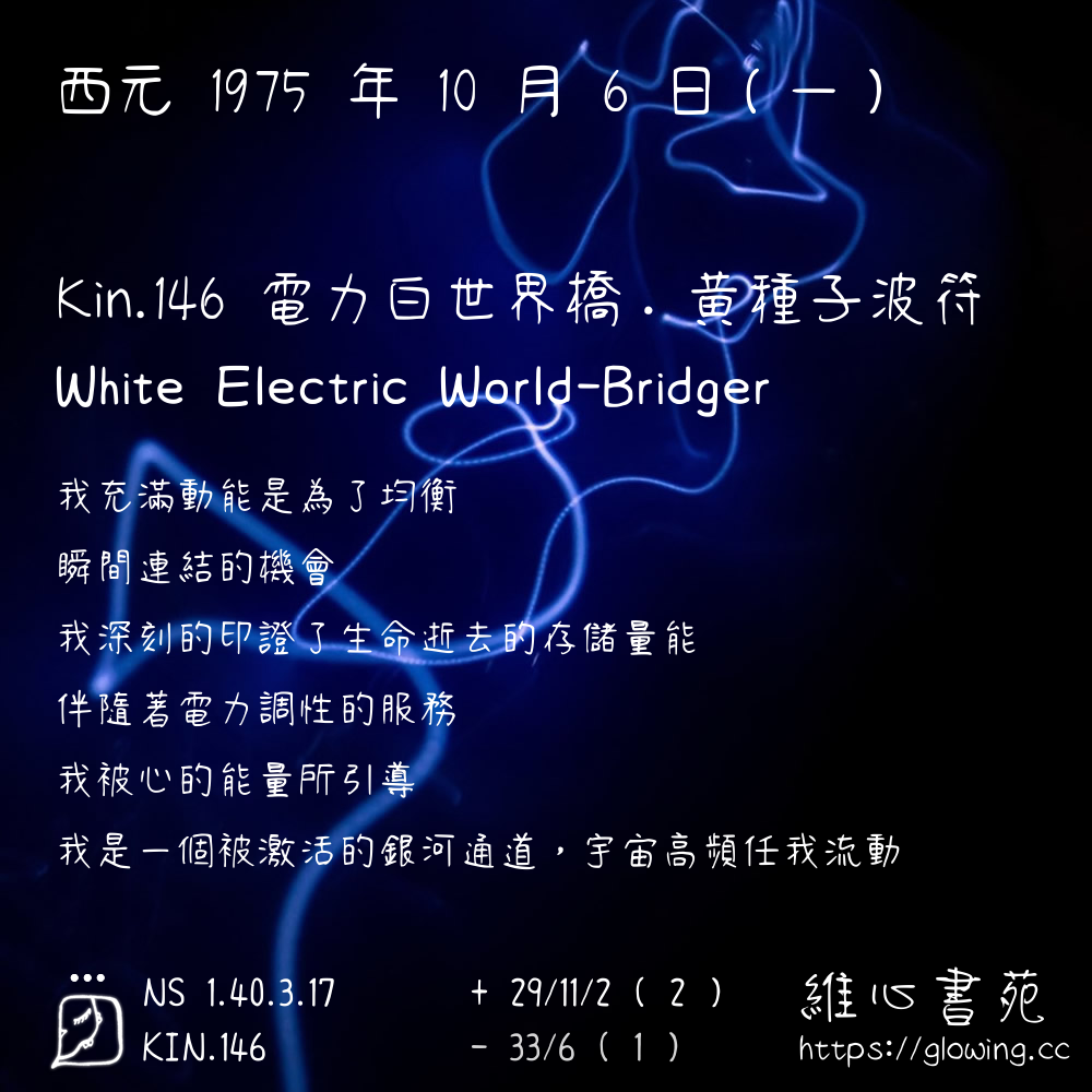 我們可以稱 KIN 146 為 【電力白世界橋】 、 【電力的白世界橋】 、 【黃種子波符 之 電力白世界橋】 也可以是 【電力白世界橋.黃種子波符】 ,你比較喜歡哪一個稱號呢?