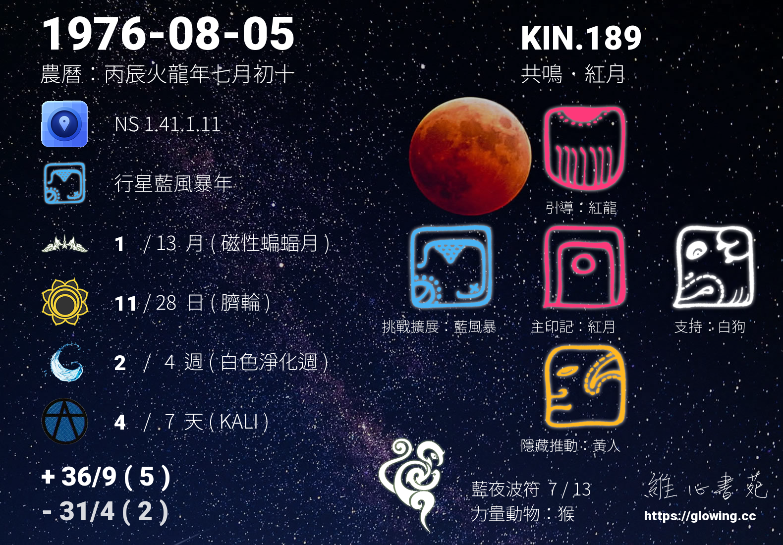 我們可以稱 KIN 189 為 【共鳴紅月】 、 【共鳴的紅月】 、 【藍夜波符 之 共鳴紅月】 也可以是 【共鳴紅月.藍夜波符】 ,你比較喜歡哪一個稱號呢?