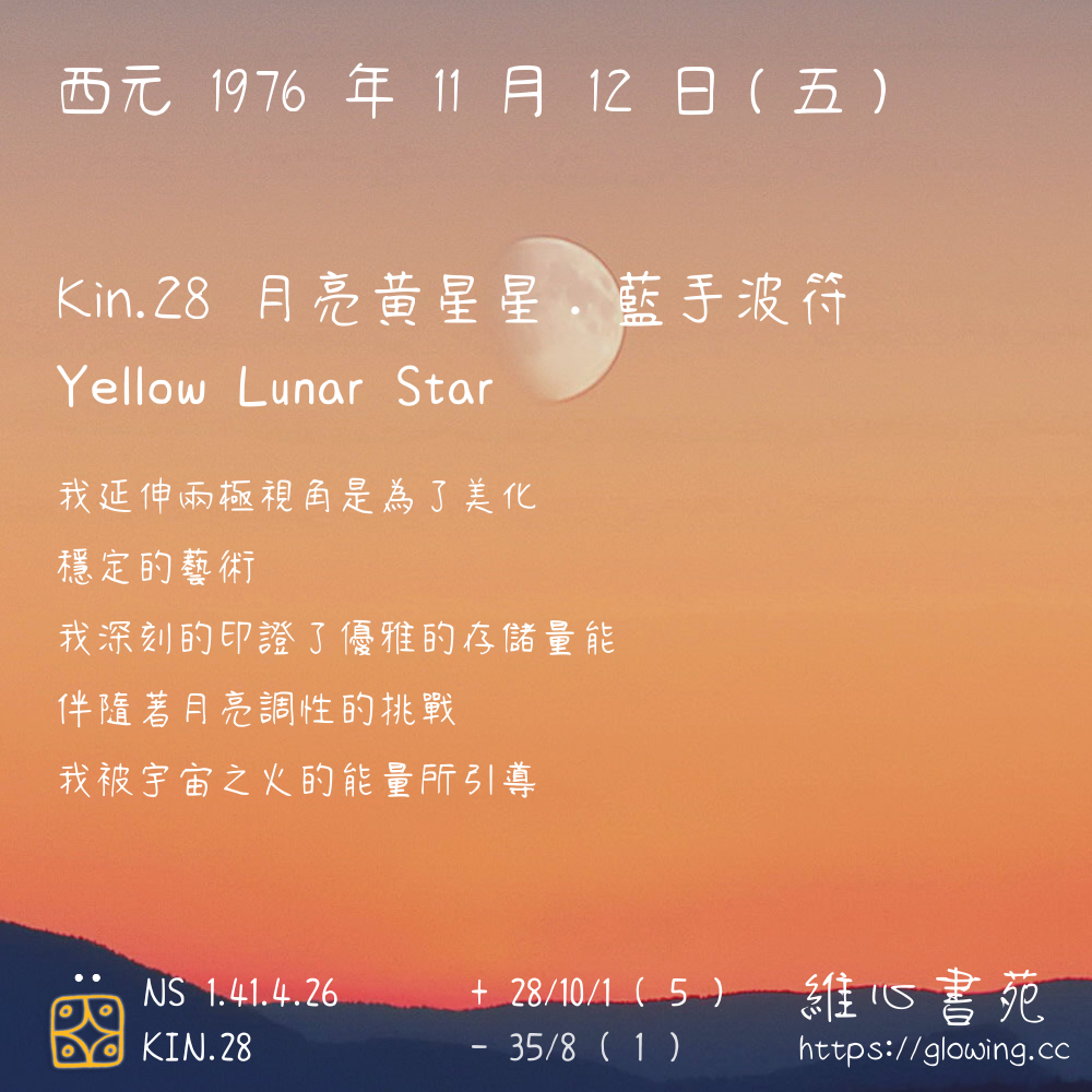 我們可以稱 KIN 28 為 【月亮黃星星】 、 【月亮的黃星星】 、 【藍手波符 之 月亮黃星星】 也可以是 【月亮黃星星.藍手波符】 ,你比較喜歡哪一個稱號呢?