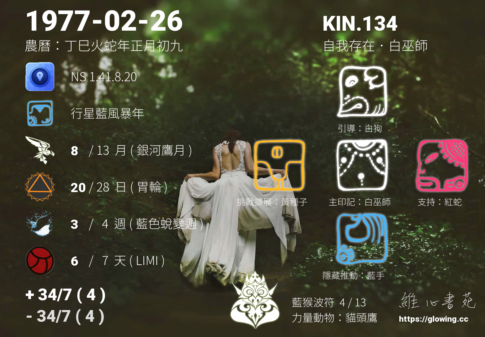 我們可以稱 KIN 134 為 【自我存在白巫師】 、 【自我存在的白巫師】 、 【藍猴波符 之 自我存在白巫師】 也可以是 【自我存在白巫師.藍猴波符】 ,你比較喜歡哪一個稱號呢?
