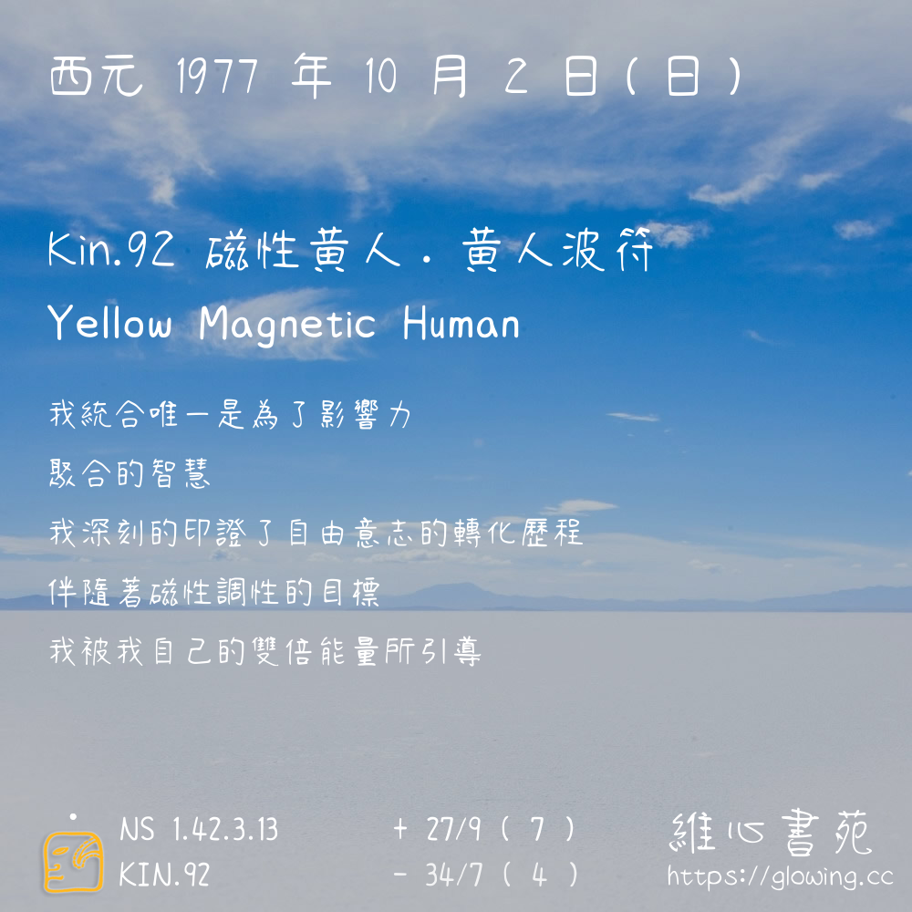 我們可以稱 KIN 92 為 【磁性黃人】 、 【磁性的黃人】 、 【黃人波符 之 磁性黃人】 也可以是 【磁性黃人.黃人波符】 ,你比較喜歡哪一個稱號呢?