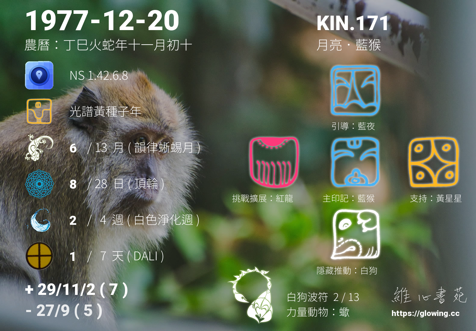 我們可以稱 KIN 171 為 【月亮藍猴】 、 【月亮的藍猴】 、 【白狗波符 之 月亮藍猴】 也可以是 【月亮藍猴.白狗波符】 ,你比較喜歡哪一個稱號呢?