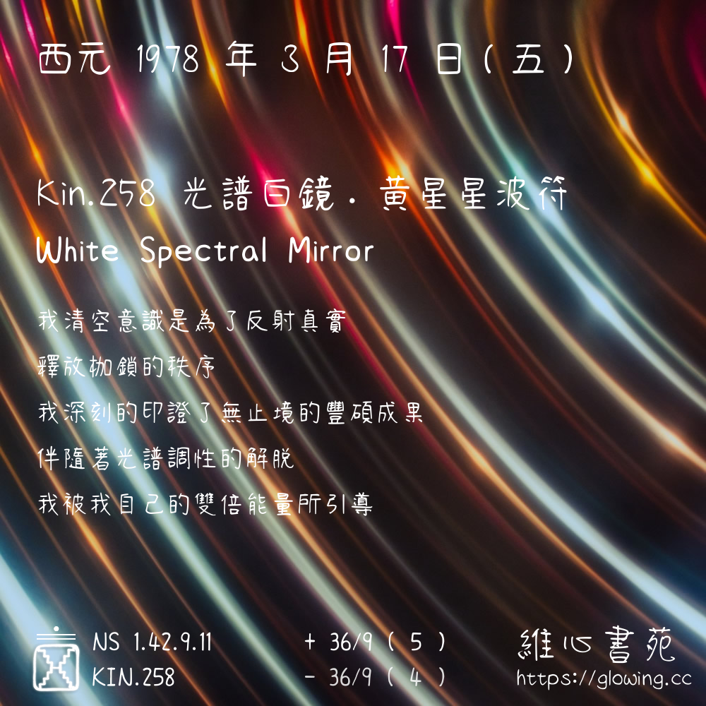 我們可以稱 KIN 258 為 【光譜白鏡】 、 【光譜的白鏡】 、 【黃星星波符 之 光譜白鏡】 也可以是 【光譜白鏡.黃星星波符】 ,你比較喜歡哪一個稱號呢?