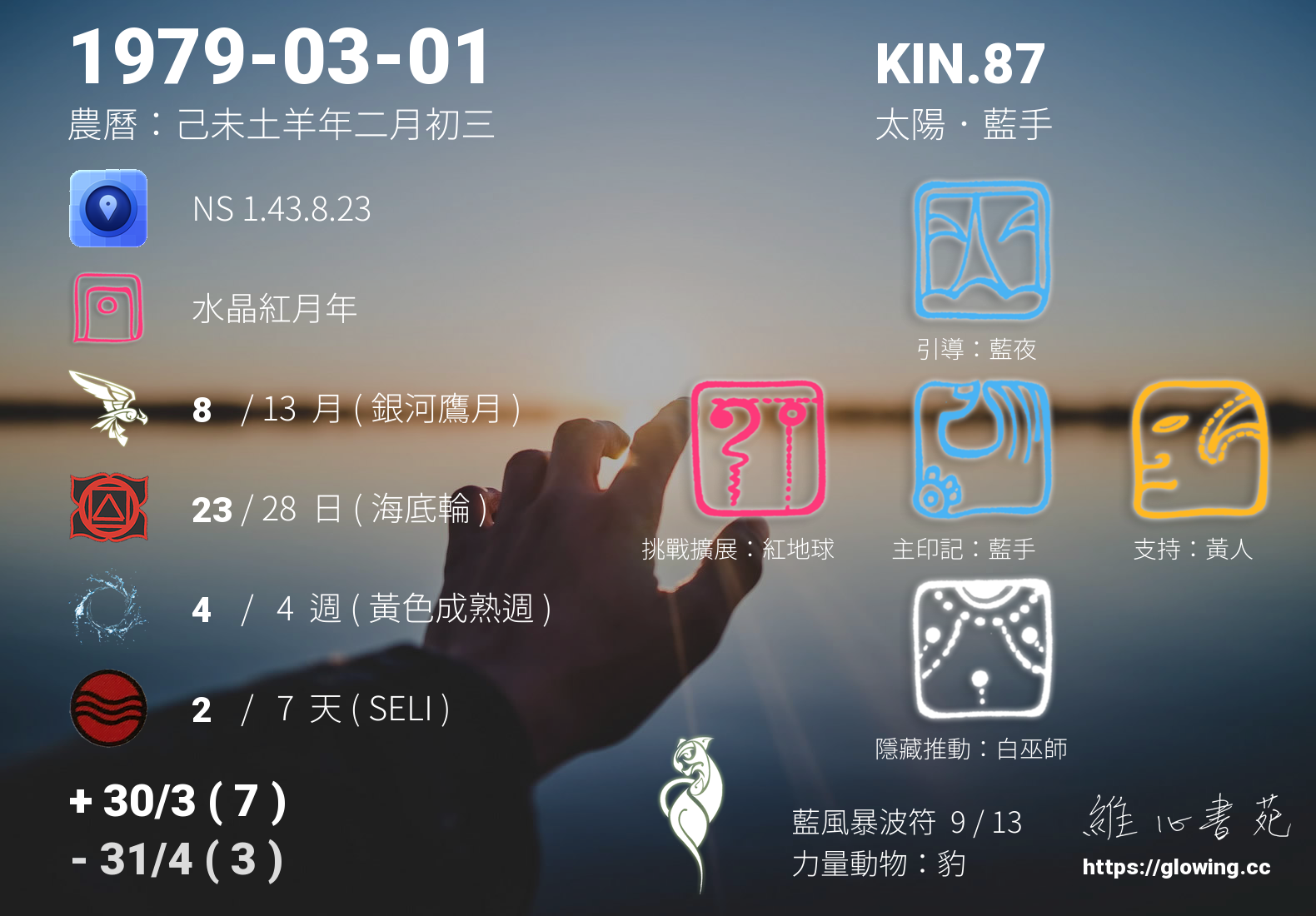 藍手的引導依據KIN的調性不同會有五種可能性,KIN.87的引導圖騰是藍夜 , 在藍夜的引導下,我們體會到,所有豐盛不是天馬行空、空中樓閣,而是在許下心願的當下,就已能量俱足,我們不用擔心願望是否實現,我們所需要的只是相信。