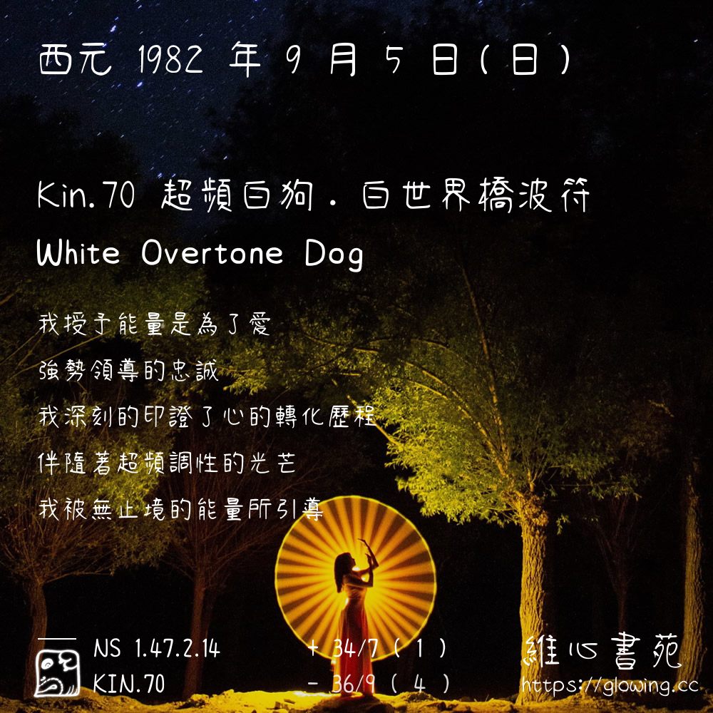我們可以稱 KIN 70 為 【超頻白狗】 、 【超頻的白狗】 、 【白世界橋波符 之 超頻白狗】 也可以是 【超頻白狗.白世界橋波符】 ,你比較喜歡哪一個稱號呢?