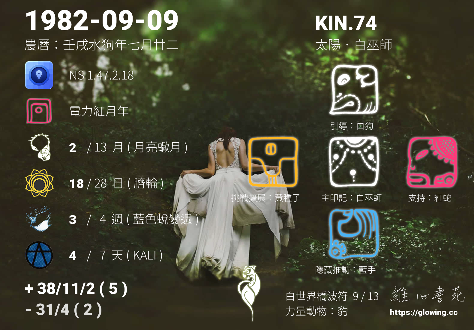 白巫師的引導依據KIN的調性不同會有五種可能性,KIN.74的引導圖騰是白狗 , 沒有白狗的引導,我們沒有辦法體會到具象的愛,真實的能量流動,需要伴隨著具象的行為模式,白狗的愛相當的純粹、自然且生動現實,我們可以全然的接受,那發自內心毫無一絲污漬的潔淨純白。