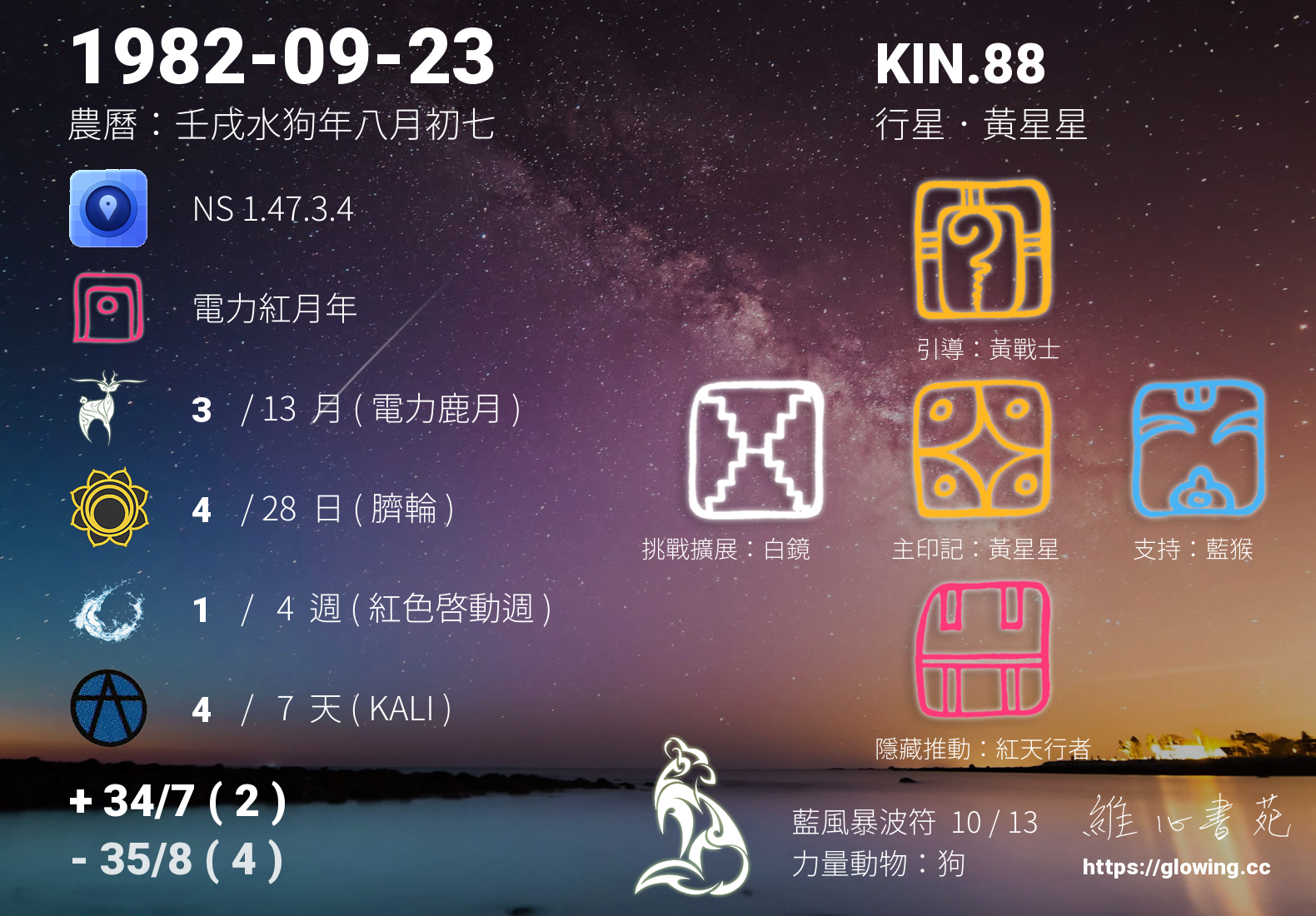 我們可以稱 KIN 88 為 【行星黃星星】 、 【行星的黃星星】 、 【藍風暴波符 之 行星黃星星】 也可以是 【行星黃星星.藍風暴波符】 ,你比較喜歡哪一個稱號呢?