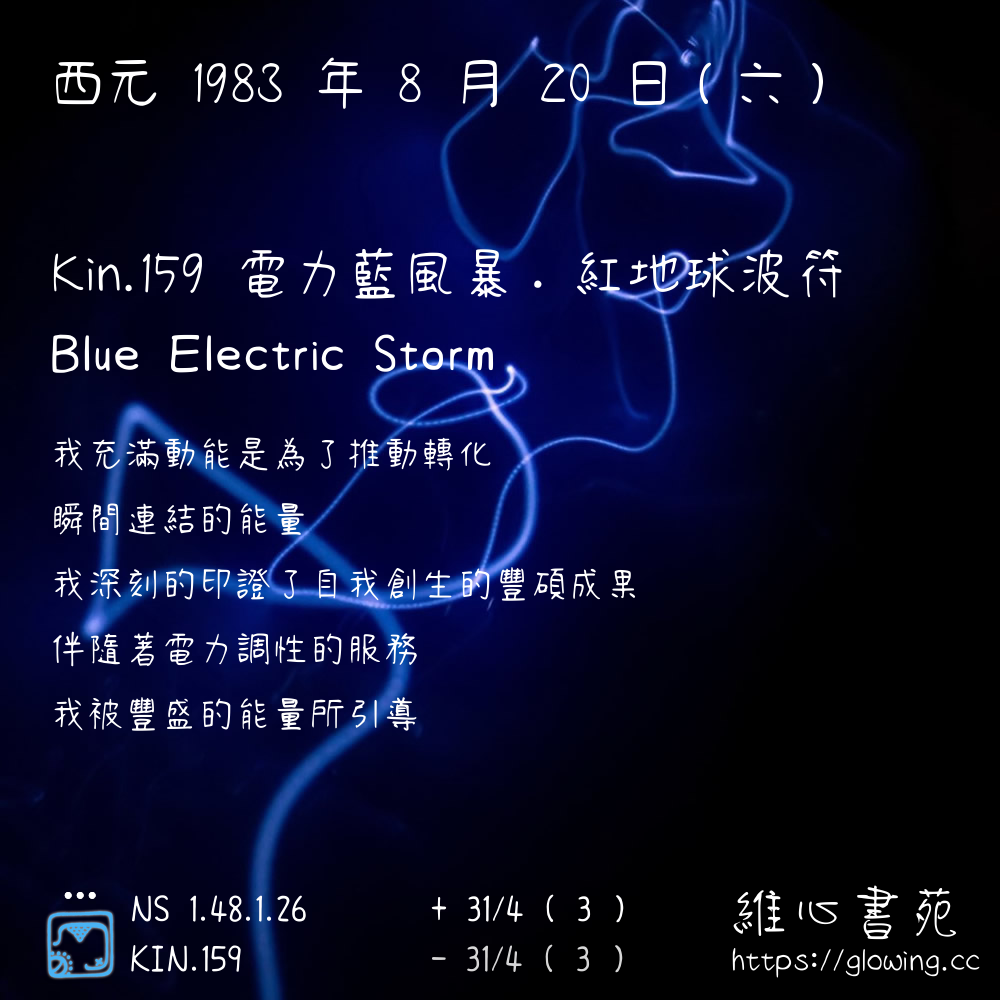 我們可以稱 KIN 159 為 【電力藍風暴】 、 【電力的藍風暴】 、 【紅地球波符 之 電力藍風暴】 也可以是 【電力藍風暴.紅地球波符】 ,你比較喜歡哪一個稱號呢?