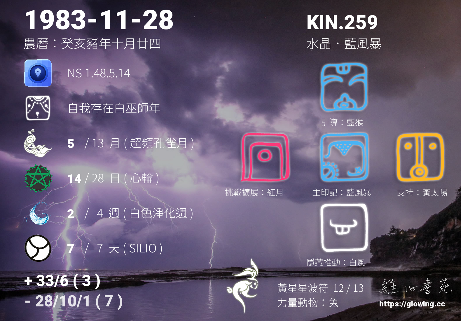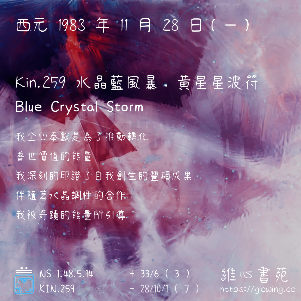 我們可以稱 KIN 259 為 【水晶藍風暴】 、 【水晶的藍風暴】 、 【黃星星波符 之 水晶藍風暴】 也可以是 【水晶藍風暴.黃星星波符】 ,你比較喜歡哪一個稱號呢?