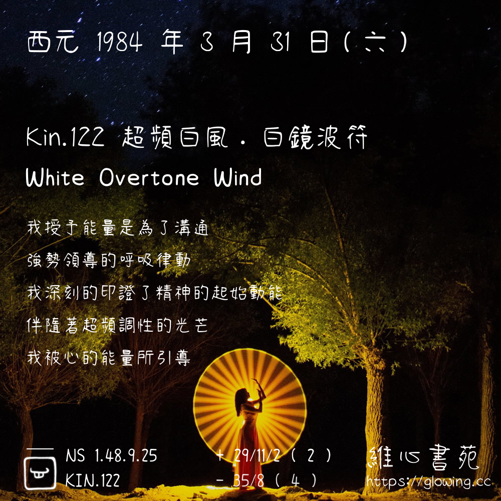 我們可以稱 KIN 122 為 【超頻白風】 、 【超頻的白風】 、 【白鏡波符 之 超頻白風】 也可以是 【超頻白風.白鏡波符】 ,你比較喜歡哪一個稱號呢?