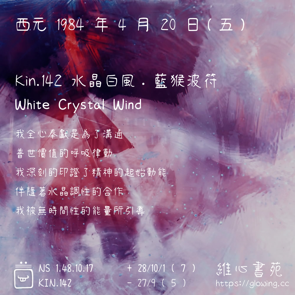 我們可以稱 KIN 142 為 【水晶白風】 、 【水晶的白風】 、 【藍猴波符 之 水晶白風】 也可以是 【水晶白風.藍猴波符】 ,你比較喜歡哪一個稱號呢?