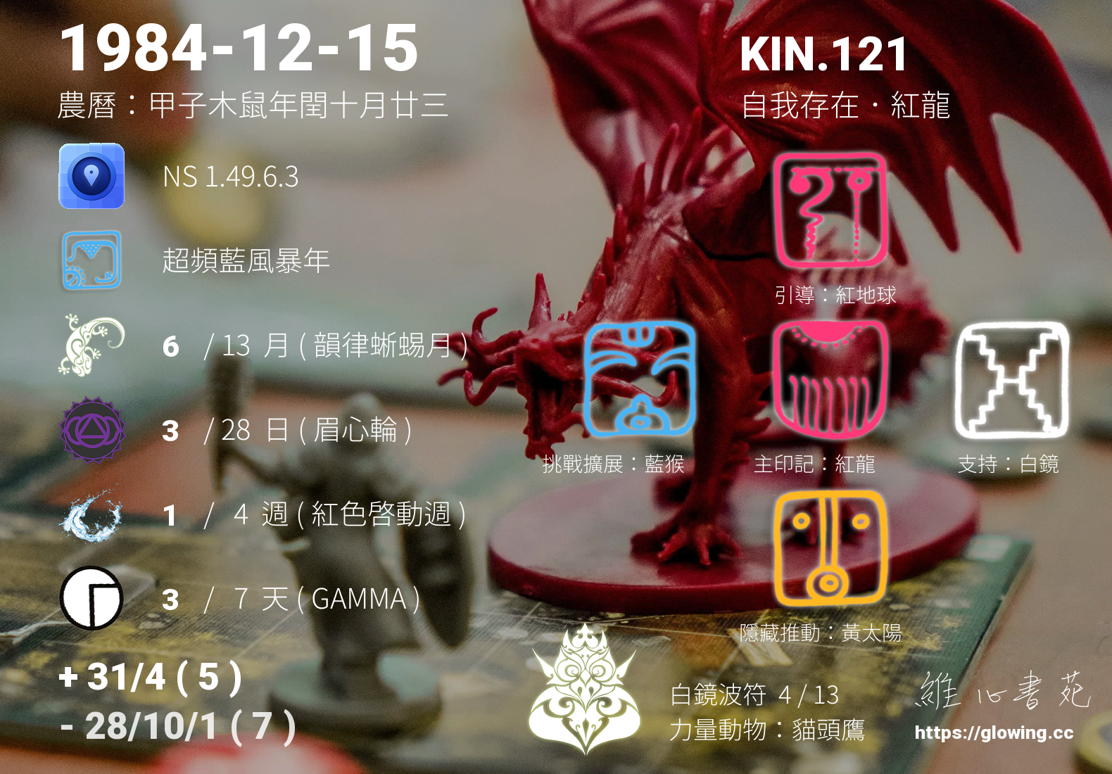 我們可以稱 KIN 121 為 【自我存在紅龍】 、 【自我存在的紅龍】 、 【白鏡波符 之 自我存在紅龍】 也可以是 【自我存在紅龍.白鏡波符】 ,你比較喜歡哪一個稱號呢?