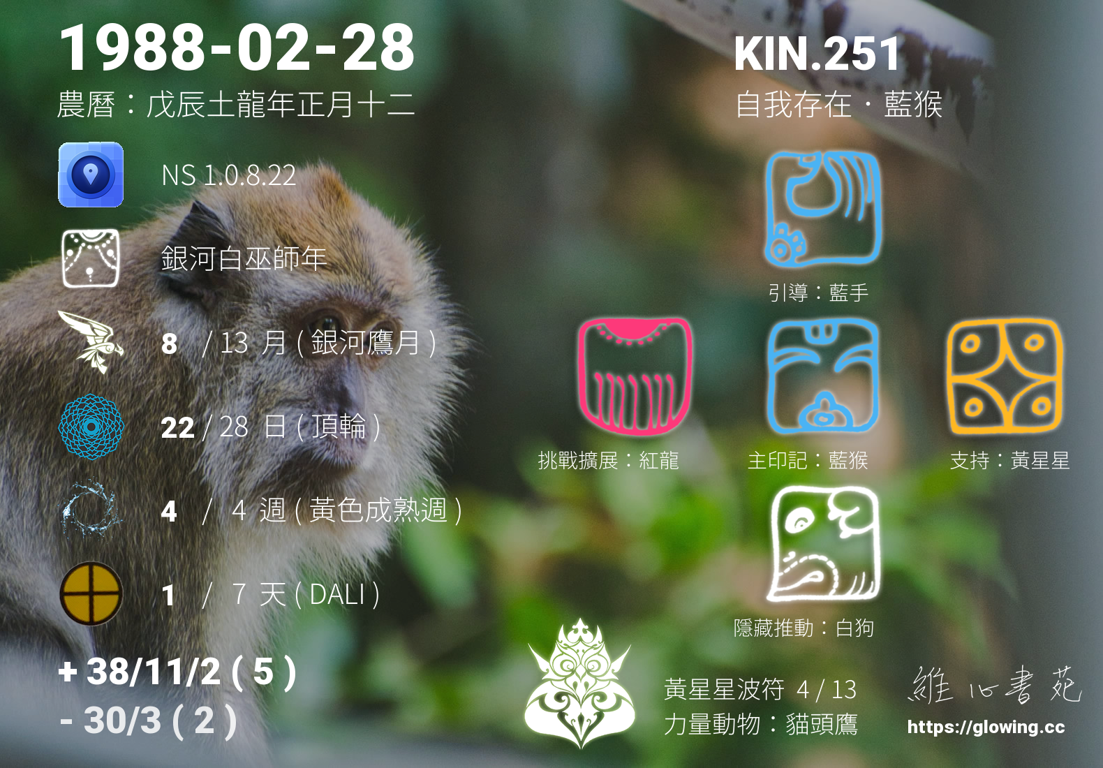 我們可以稱 KIN 251 為 【自我存在藍猴】 、 【自我存在的藍猴】 、 【黃星星波符 之 自我存在藍猴】 也可以是 【自我存在藍猴.黃星星波符】 ,你比較喜歡哪一個稱號呢?