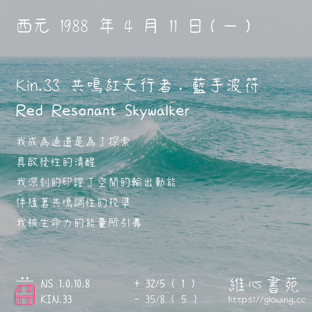 我們可以稱 KIN 33 為 【共鳴紅天行者】 、 【共鳴的紅天行者】 、 【藍手波符 之 共鳴紅天行者】 也可以是 【共鳴紅天行者.藍手波符】 ,你比較喜歡哪一個稱號呢?