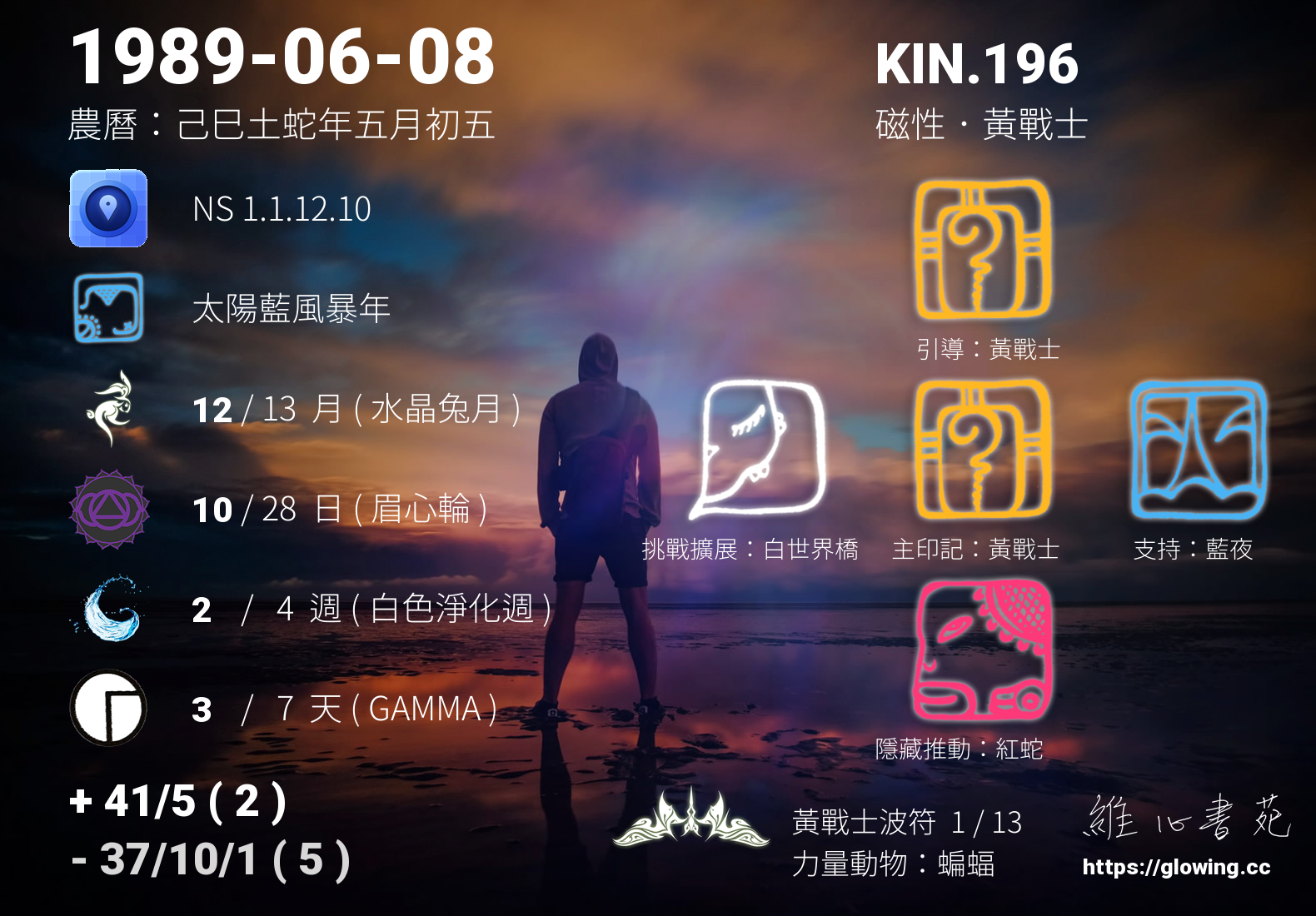 黃戰士的引導依據KIN的調性不同會有五種可能性,KIN.196的引導圖騰是黃戰士 , 黃戰士引導著我們勇敢無懼地去實現夢想,所有的夢想都需要時間去成就,在一步步的突破中我們需要無比的勇氣,黃戰士的無畏提供我們滋糧,讓我們堅實挺立不畏風霜,終將取得豐碩的成果。