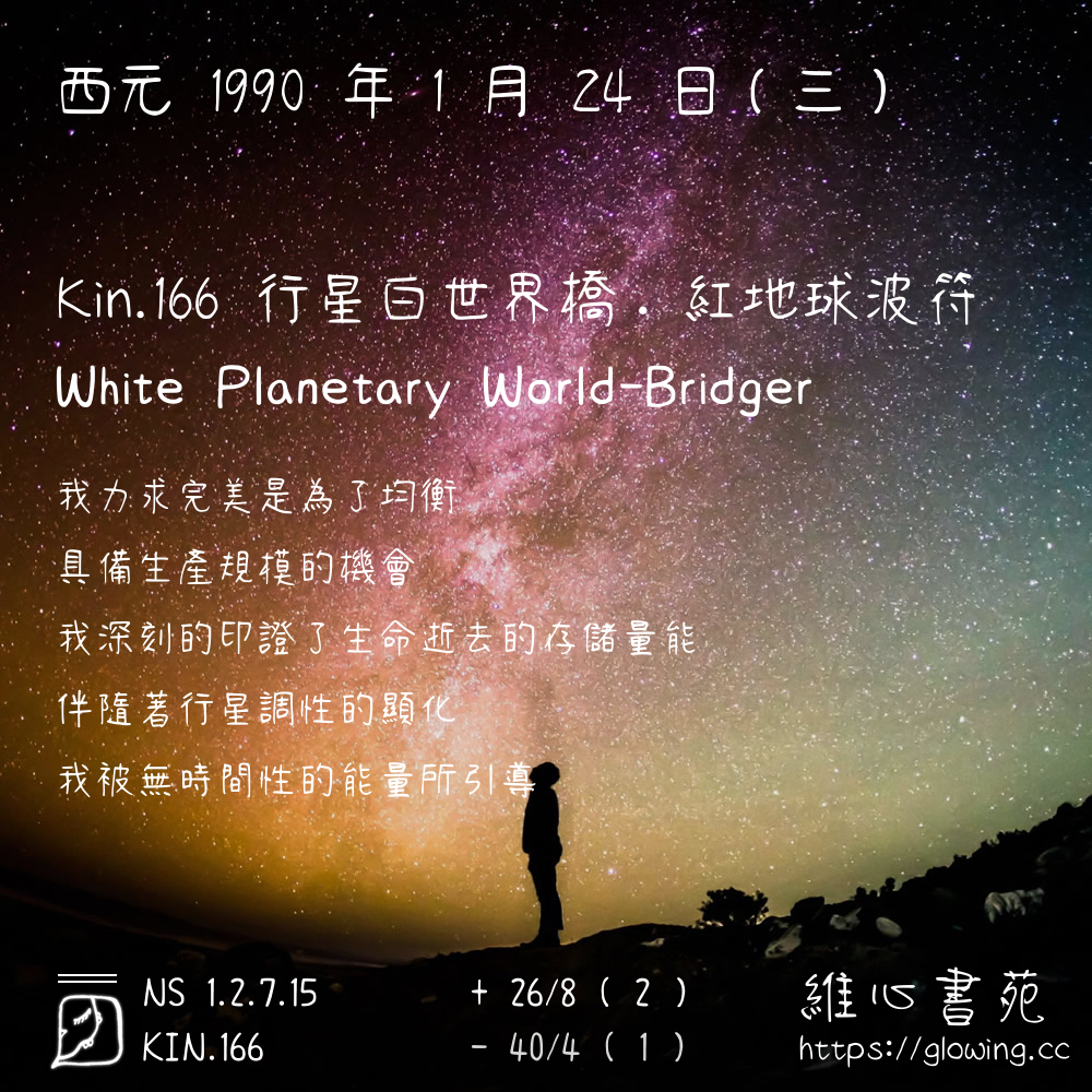 我們可以稱 KIN 166 為 【行星白世界橋】 、 【行星的白世界橋】 、 【紅地球波符 之 行星白世界橋】 也可以是 【行星白世界橋.紅地球波符】 ,你比較喜歡哪一個稱號呢?