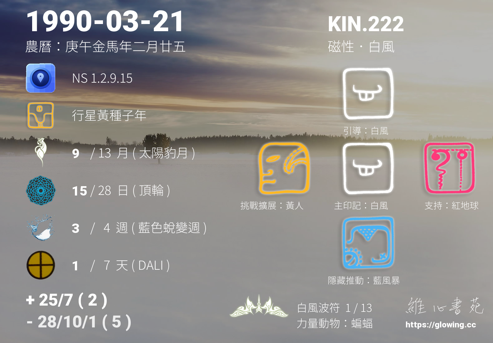 白風的引導依據KIN的調性不同會有五種可能性,KIN.222的引導圖騰是白風 , 在白風的引導下,我們理解到沒有什麼是沒有能量的,所有的言語可以幻化成純然的愛或鋒利的劍,可惜的是,我們並不能從發話口中決定最終的能量態樣,受話人的能量品質決定了言語能量的質量。