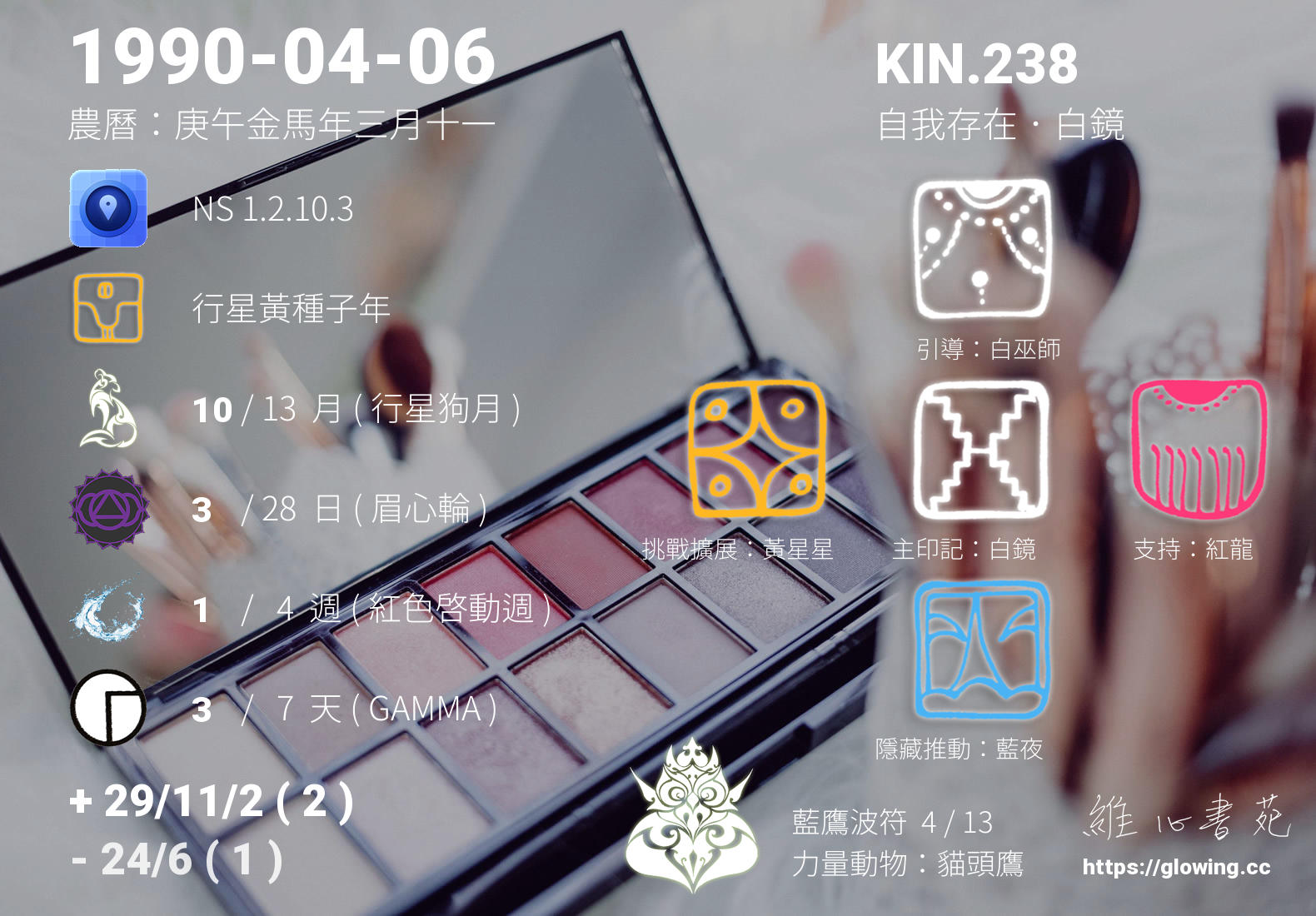 我們可以稱 KIN 238 為 【自我存在白鏡】 、 【自我存在的白鏡】 、 【藍鷹波符 之 自我存在白鏡】 也可以是 【自我存在白鏡.藍鷹波符】 ,你比較喜歡哪一個稱號呢?
