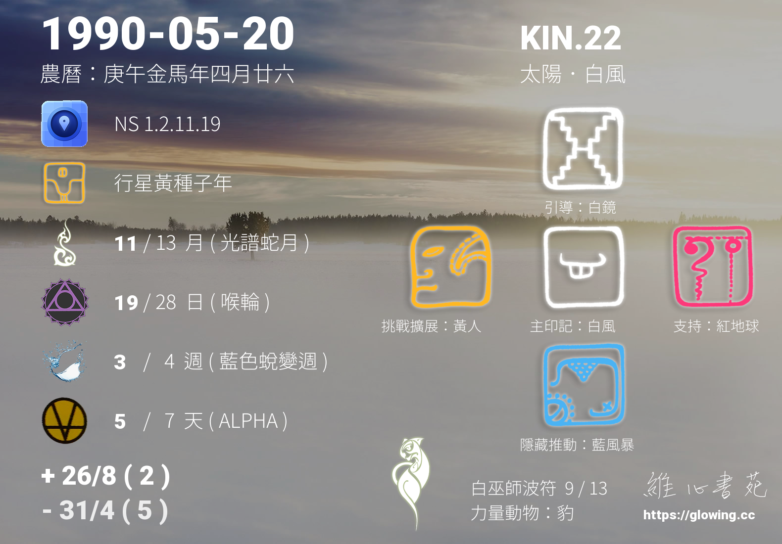 我們可以稱 KIN 22 為 【太陽白風】 、 【太陽的白風】 、 【白巫師波符 之 太陽白風】 也可以是 【太陽白風.白巫師波符】 ,你比較喜歡哪一個稱號呢?