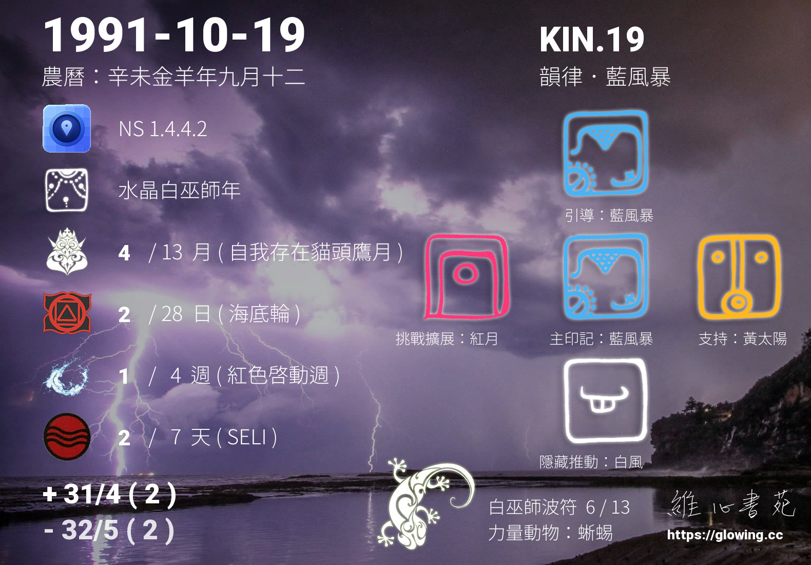 我們可以稱 KIN 19 為 【韻律藍風暴】 、 【韻律的藍風暴】 、 【白巫師波符 之 韻律藍風暴】 也可以是 【韻律藍風暴.白巫師波符】 ,你比較喜歡哪一個稱號呢?