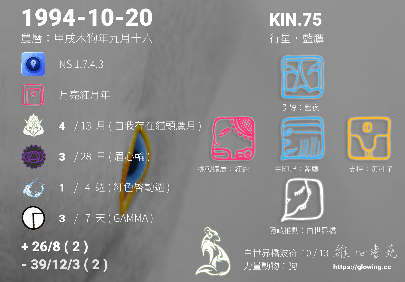 我們可以稱 KIN 75 為 【行星藍鷹】 、 【行星的藍鷹】 、 【白世界橋波符 之 行星藍鷹】 也可以是 【行星藍鷹.白世界橋波符】 ,你比較喜歡哪一個稱號呢?