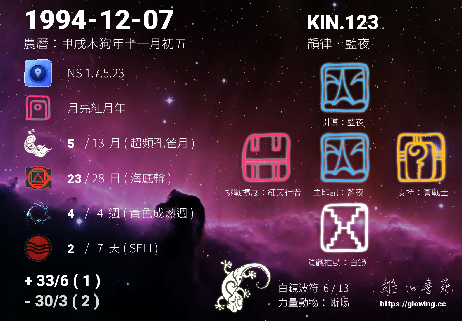 我們可以稱 KIN 123 為 【韻律藍夜】 、 【韻律的藍夜】 、 【白鏡波符 之 韻律藍夜】 也可以是 【韻律藍夜.白鏡波符】 ,你比較喜歡哪一個稱號呢?