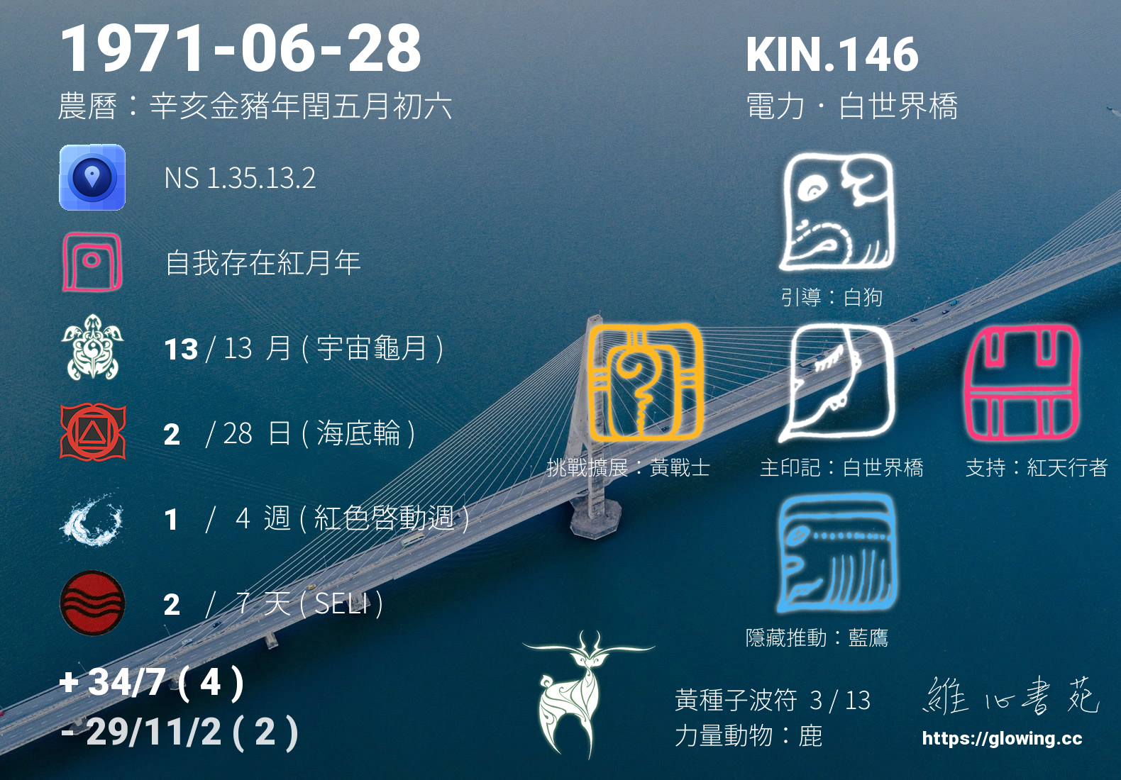 我們可以稱 KIN 146 為 【電力白世界橋】 、 【電力的白世界橋】 、 【黃種子波符 之 電力白世界橋】 也可以是 【電力白世界橋.黃種子波符】 ,你比較喜歡哪一個稱號呢?