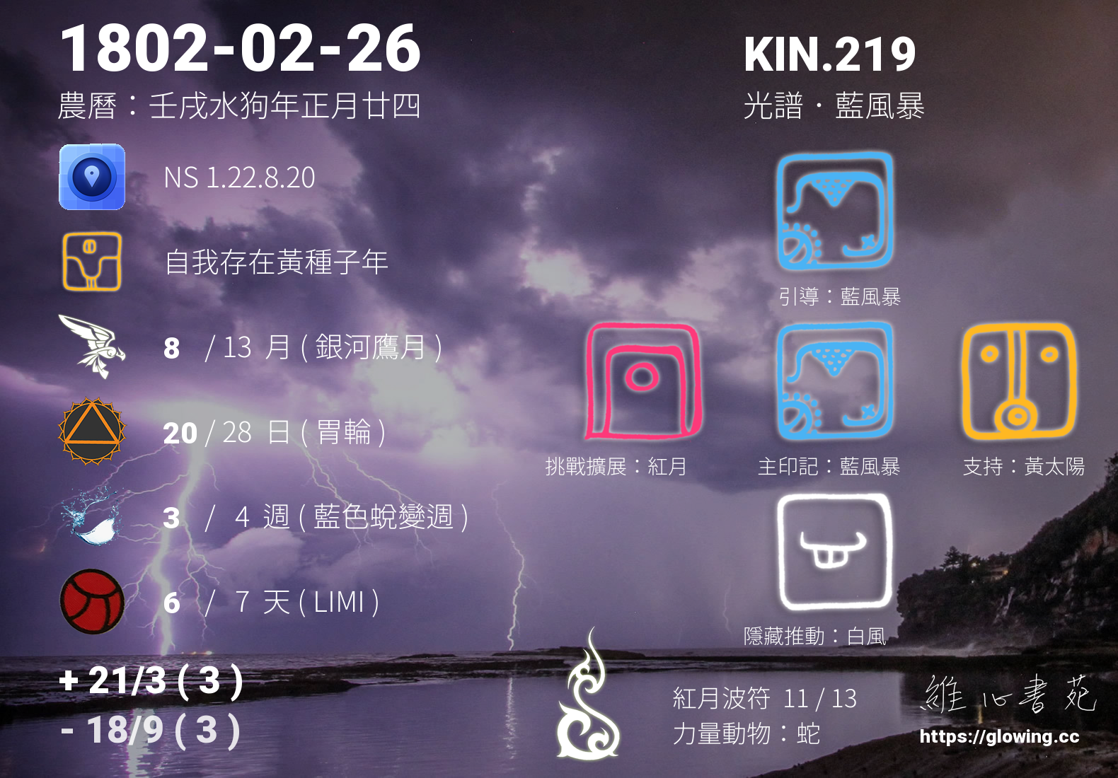 藍風暴的引導依據KIN的調性不同會有五種可能性,KIN.219的引導圖騰是藍風暴 , 藍風暴引領著我們誠心地祈求,祈求一切歸於虛無,因為所有的一切始於空,也將終於空,我們帶不走任何一絲一毫的能量,我們能做的就僅僅是意識到,我們終將回歸,如此而已。