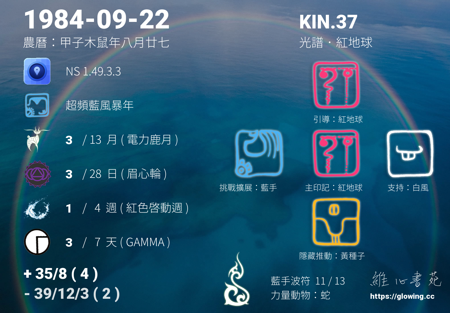 我們可以稱 KIN 37 為 【光譜紅地球】 、 【光譜的紅地球】 、 【藍手波符 之 光譜紅地球】 也可以是 【光譜紅地球.藍手波符】 ,你比較喜歡哪一個稱號呢?