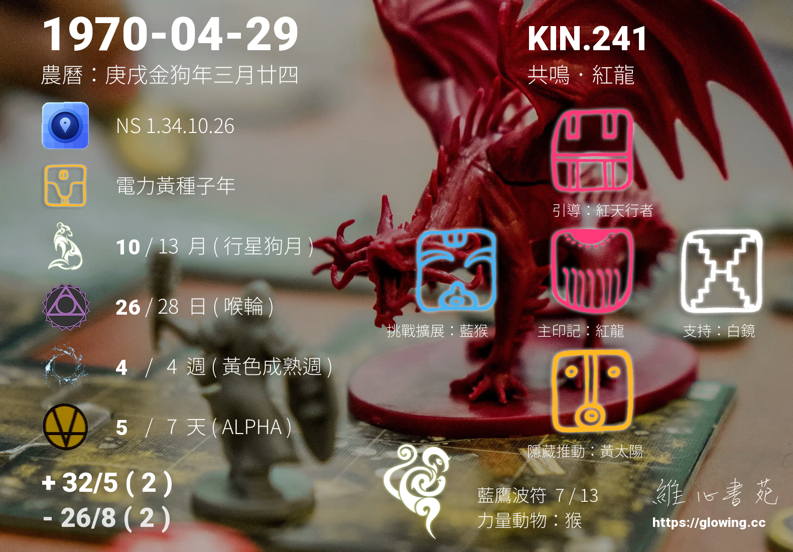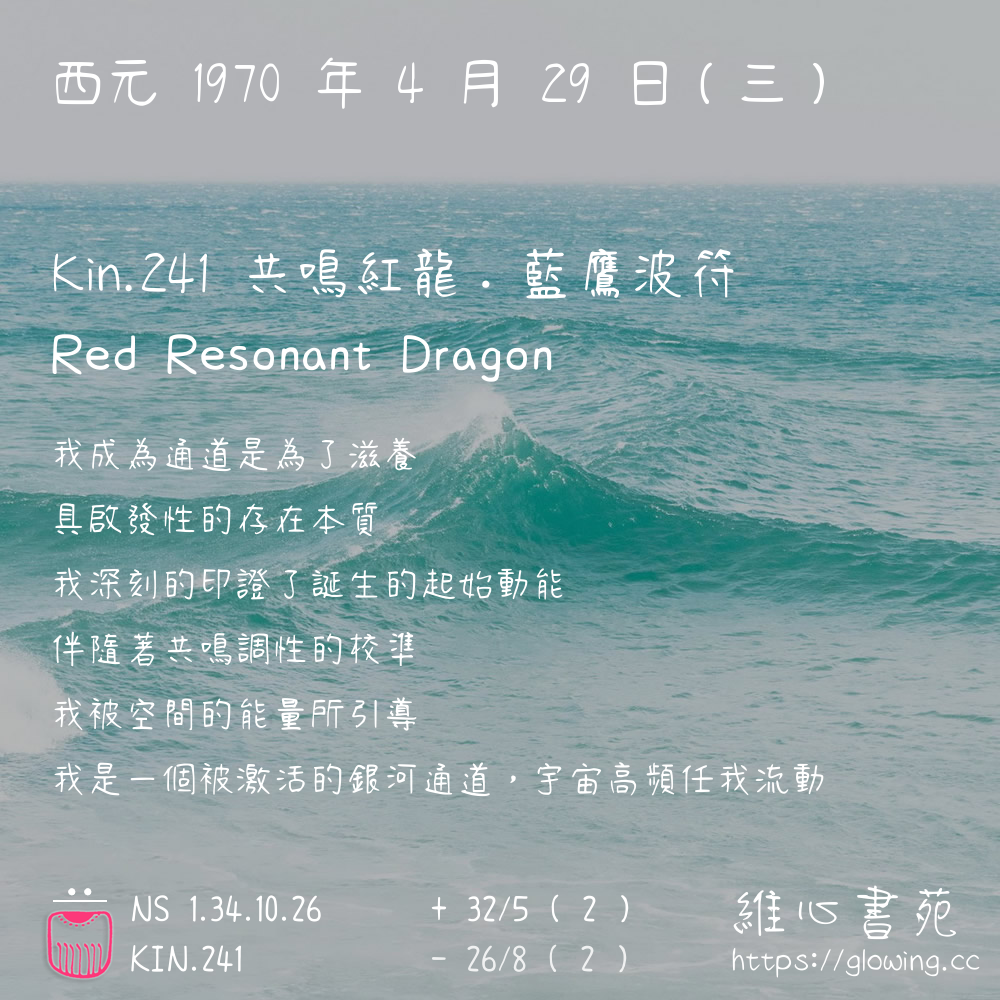 我們可以稱 KIN 241 為 【共鳴紅龍】 、 【共鳴的紅龍】 、 【藍鷹波符 之 共鳴紅龍】 也可以是 【共鳴紅龍.藍鷹波符】 ,你比較喜歡哪一個稱號呢?