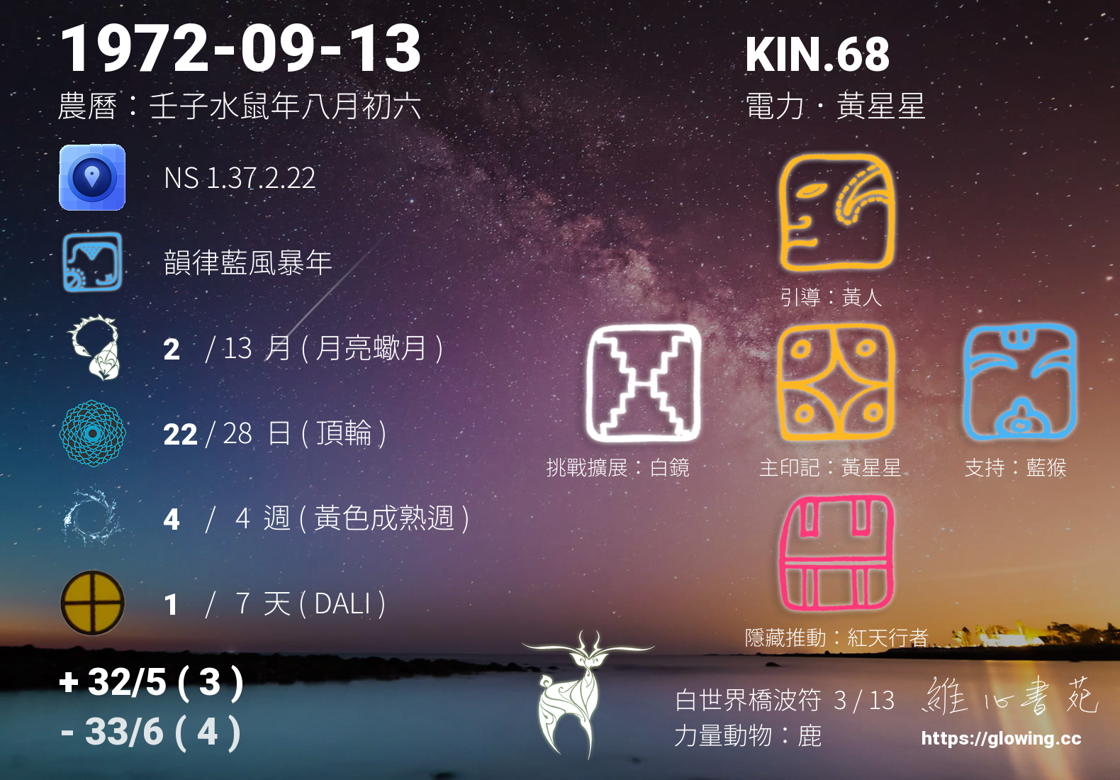 黃星星的引導依據KIN的調性不同會有五種可能性,KIN.68的引導圖騰是黃人 , 黃人引導著我們崇尚智慧,探求內心的平靜能量,在一次次更深入看見自己內在的過程,我們能夠更清楚,所有的連結無須外求,我與內在的連結越緊密,生命將越加的繽紛。