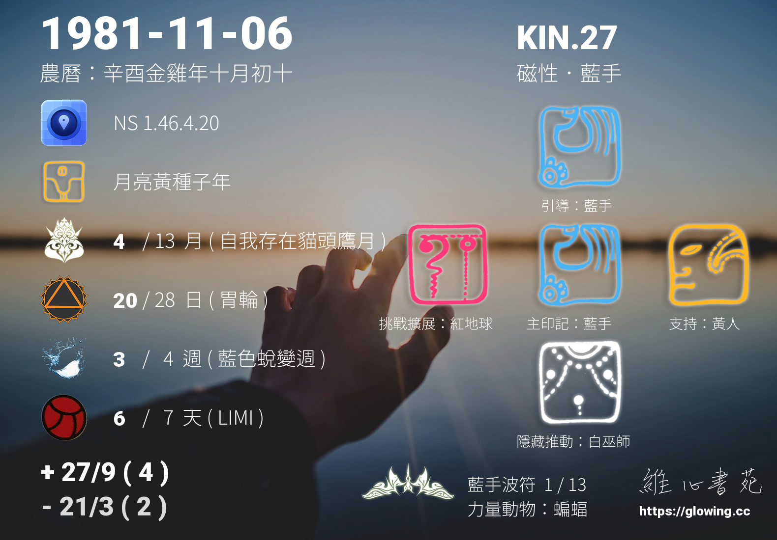 我們可以稱 KIN 27 為 【磁性藍手】 、 【磁性的藍手】 、 【藍手波符 之 磁性藍手】 也可以是 【磁性藍手.藍手波符】 ,你比較喜歡哪一個稱號呢?