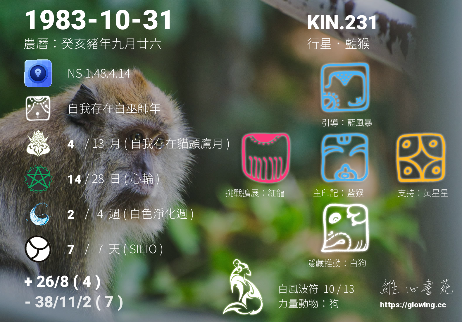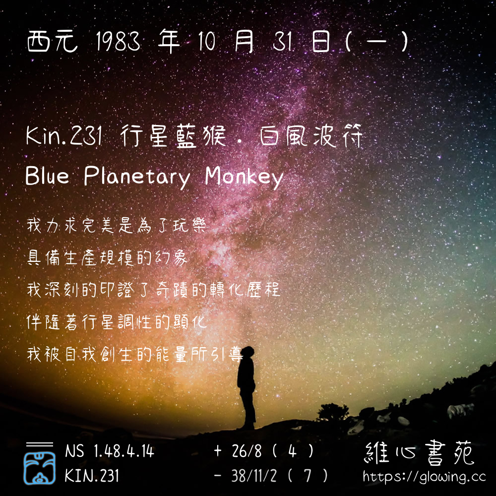 我們可以稱 KIN 231 為 【行星藍猴】 、 【行星的藍猴】 、 【白風波符 之 行星藍猴】 也可以是 【行星藍猴.白風波符】 ,你比較喜歡哪一個稱號呢?