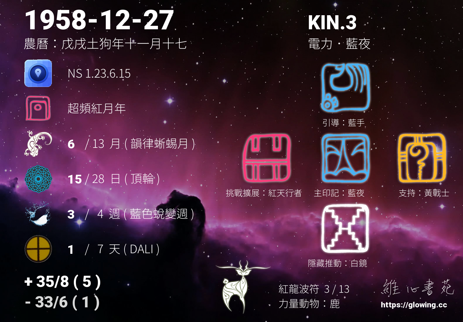 今天的星際原型圖騰為藍夜,我們稱之為主印記, 藍夜是夢想家的原型,有將夢想成真的天賦,直覺力強,在實踐夢想的過程中樂於分享將能更享豐盛。