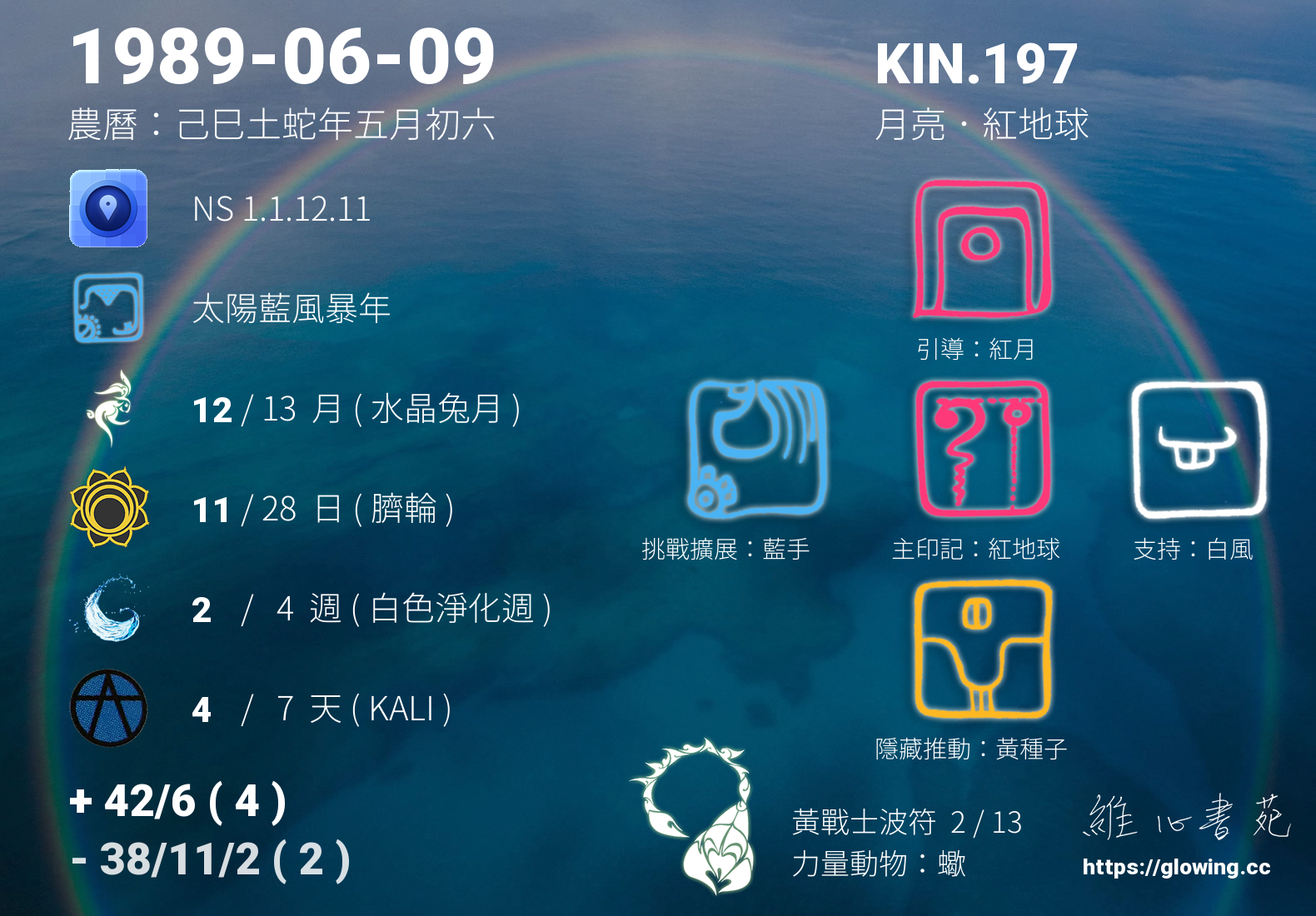 我們可以稱 KIN 197 為 【月亮紅地球】 、 【月亮的紅地球】 、 【黃戰士波符 之 月亮紅地球】 也可以是 【月亮紅地球.黃戰士波符】 ,你比較喜歡哪一個稱號呢?