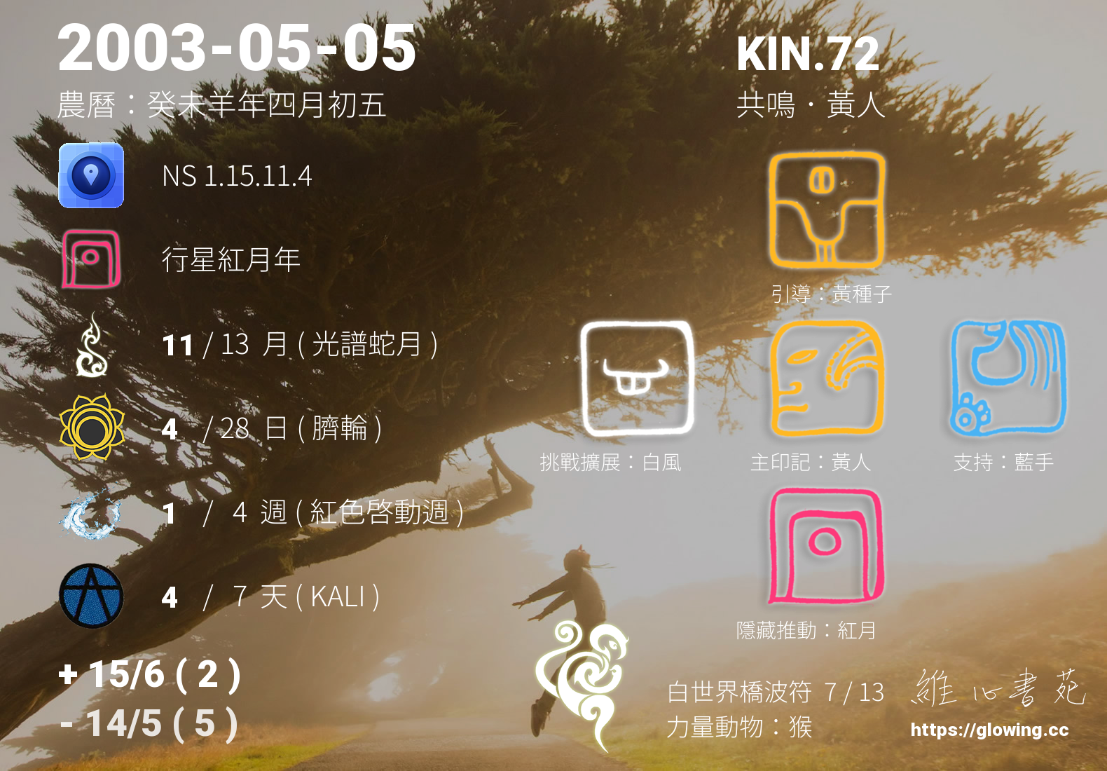 我們可以稱 KIN 72 為 【共鳴黃人】 、 【共鳴的黃人】 、 【白世界橋波符 之 共鳴黃人】 也可以是 【共鳴黃人.白世界橋波符】 ,你比較喜歡哪一個稱號呢?