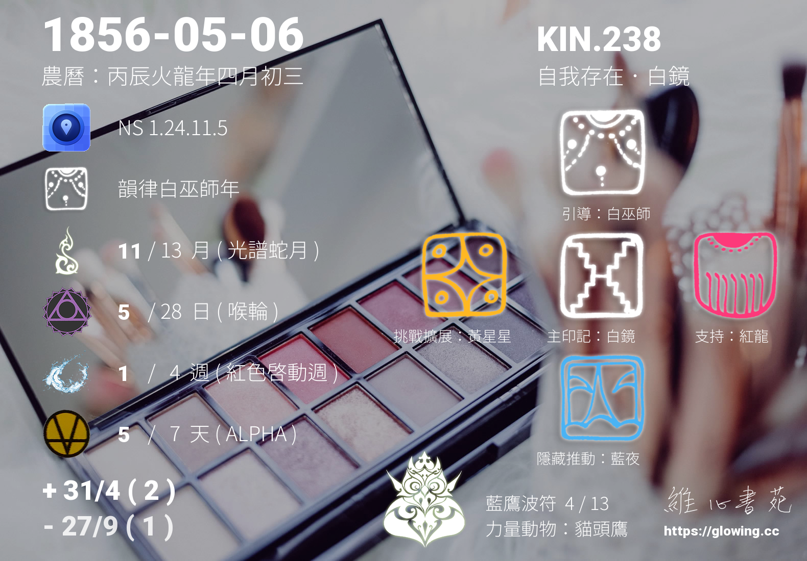 我們可以稱 KIN 238 為 【自我存在白鏡】 、 【自我存在的白鏡】 、 【藍鷹波符 之 自我存在白鏡】 也可以是 【自我存在白鏡.藍鷹波符】 ,你比較喜歡哪一個稱號呢?
