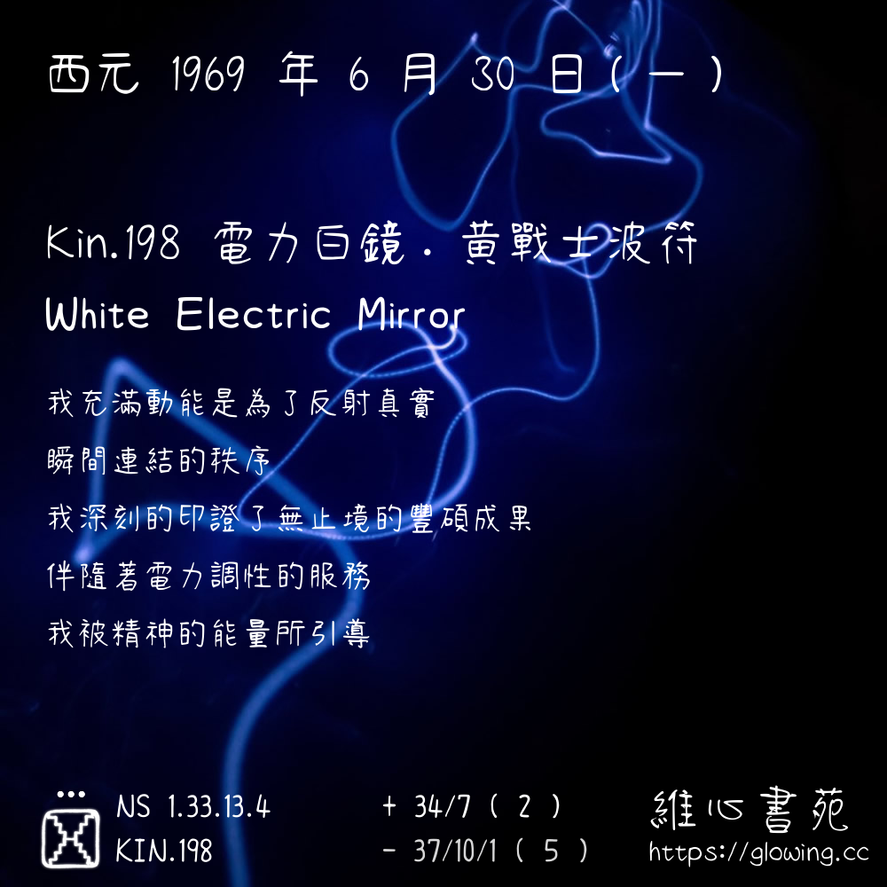 我們可以稱 KIN 198 為 【電力白鏡】 、 【電力的白鏡】 、 【黃戰士波符 之 電力白鏡】 也可以是 【電力白鏡.黃戰士波符】 ,你比較喜歡哪一個稱號呢?
