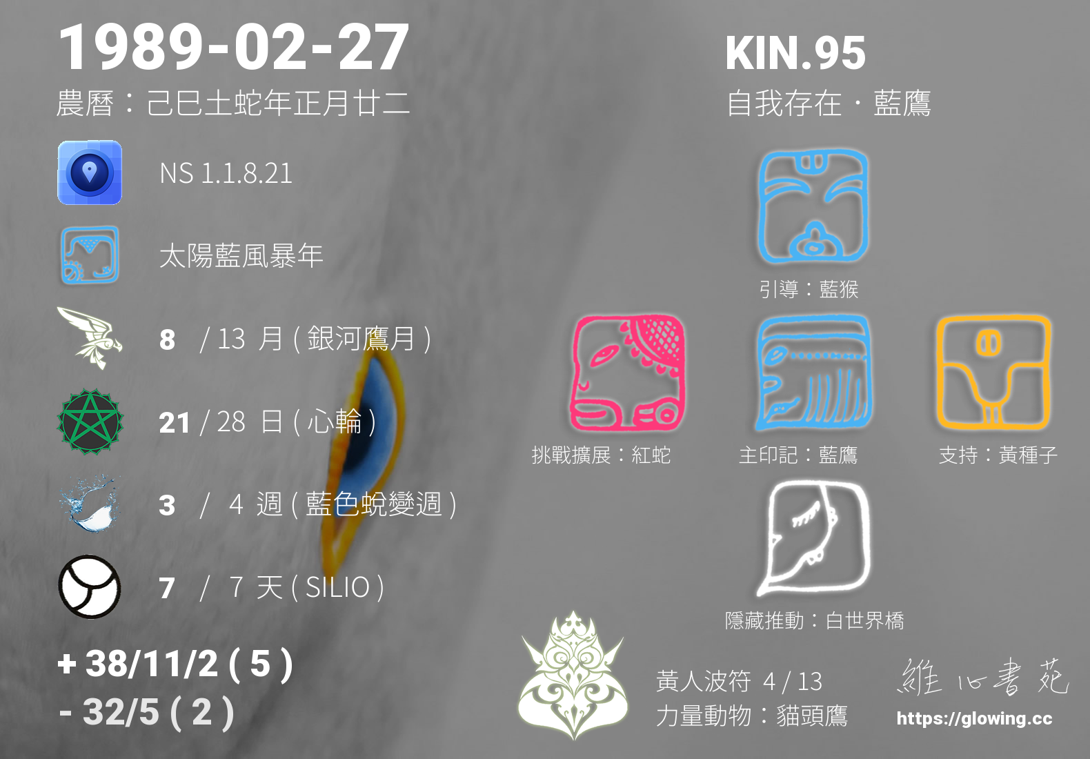 我們可以稱 KIN 95 為 【自我存在藍鷹】 、 【自我存在的藍鷹】 、 【黃人波符 之 自我存在藍鷹】 也可以是 【自我存在藍鷹.黃人波符】 ,你比較喜歡哪一個稱號呢?