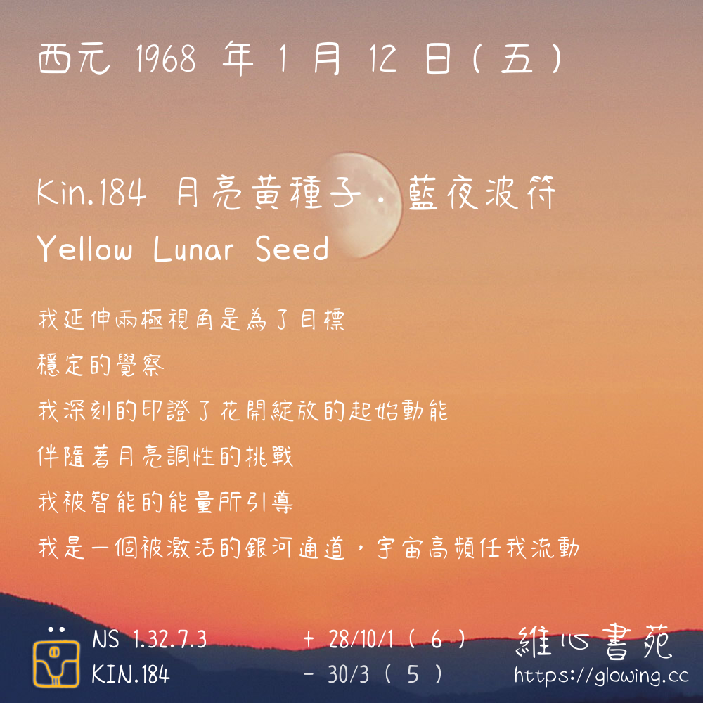 我們可以稱 KIN 184 為 【月亮黃種子】 、 【月亮的黃種子】 、 【藍夜波符 之 月亮黃種子】 也可以是 【月亮黃種子.藍夜波符】 ,你比較喜歡哪一個稱號呢?