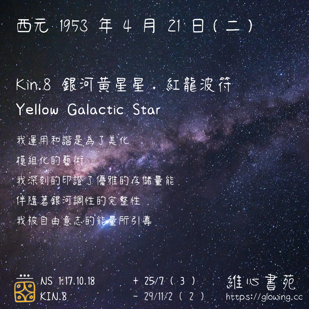 我們可以稱 KIN 8 為 【銀河黃星星】 、 【銀河的黃星星】 、 【紅龍波符 之 銀河黃星星】 也可以是 【銀河黃星星.紅龍波符】 ,你比較喜歡哪一個稱號呢?