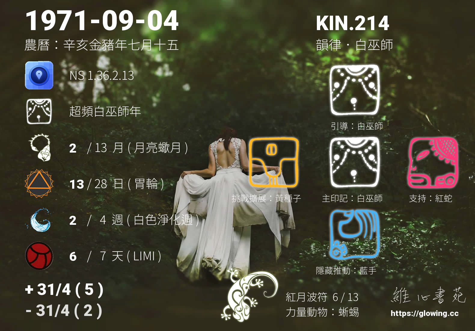 白巫師的引導依據KIN的調性不同會有五種可能性,KIN.214的引導圖騰是白巫師 , 白巫師引導著我們看見自己的不安,因為不安,所以我們尋求解答,因為不安,所以我在現實外,尋找安心的方向與方式。
