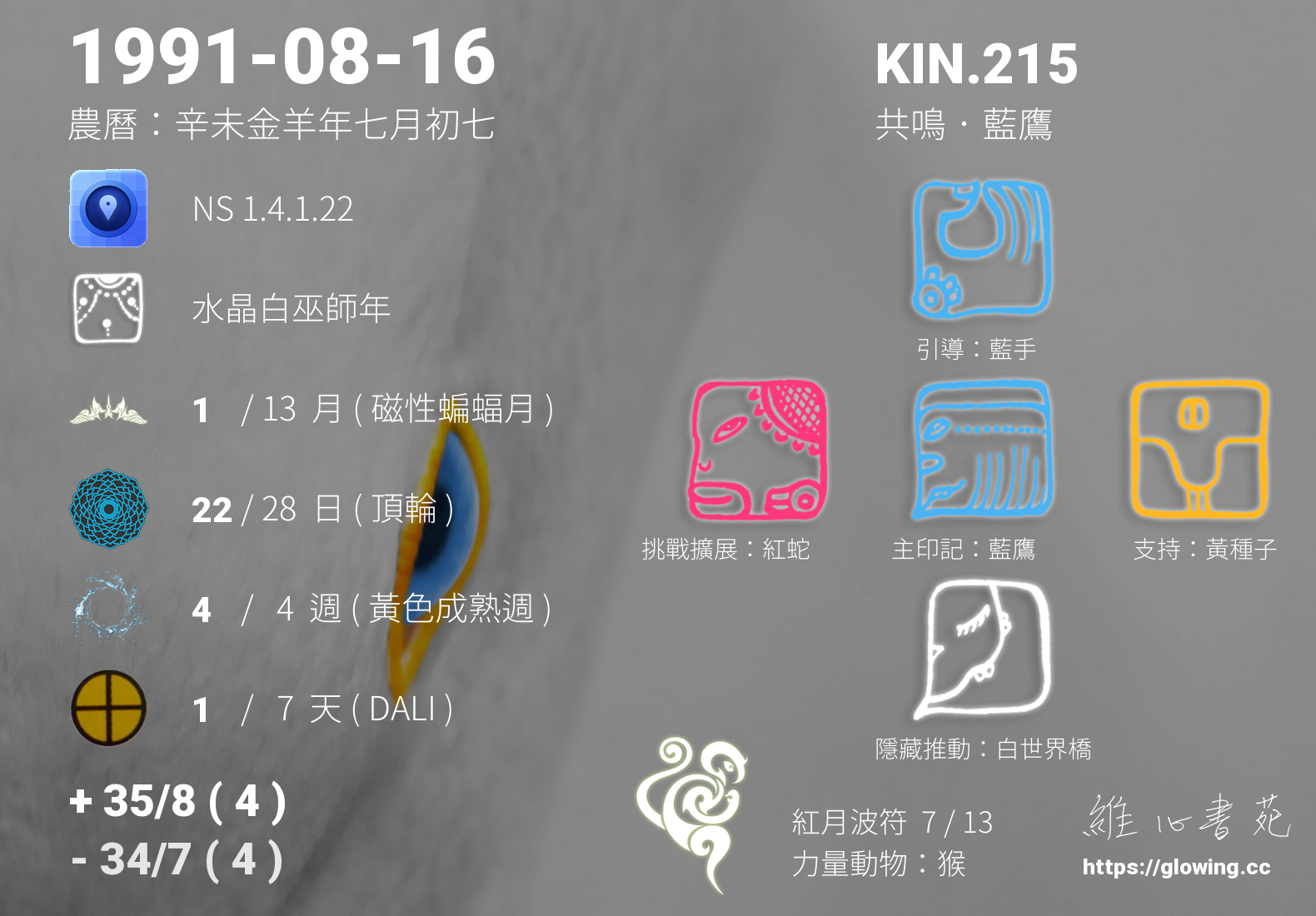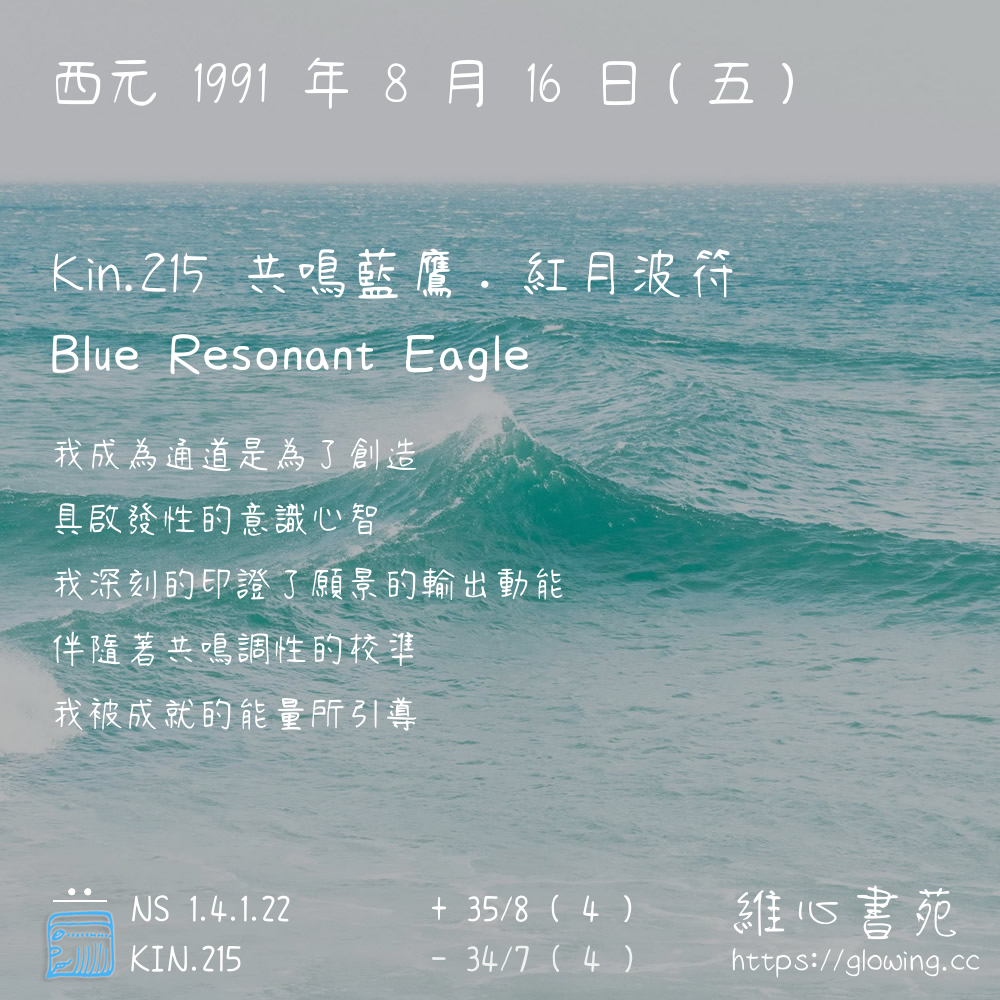 我們可以稱 KIN 215 為 【共鳴藍鷹】 、 【共鳴的藍鷹】 、 【紅月波符 之 共鳴藍鷹】 也可以是 【共鳴藍鷹.紅月波符】 ,你比較喜歡哪一個稱號呢?