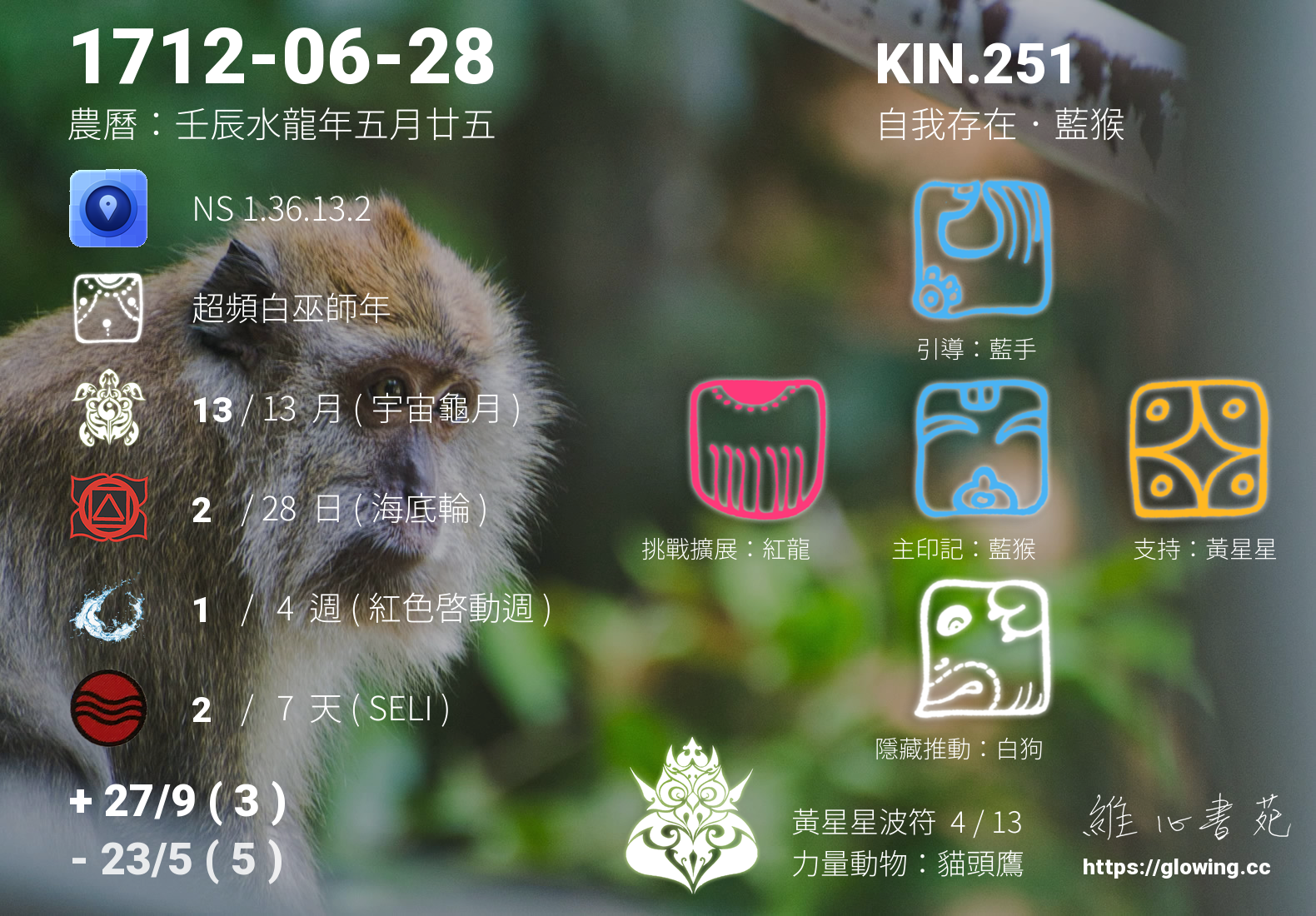 我們可以稱 KIN 251 為 【自我存在藍猴】 、 【自我存在的藍猴】 、 【黃星星波符 之 自我存在藍猴】 也可以是 【自我存在藍猴.黃星星波符】 ,你比較喜歡哪一個稱號呢?